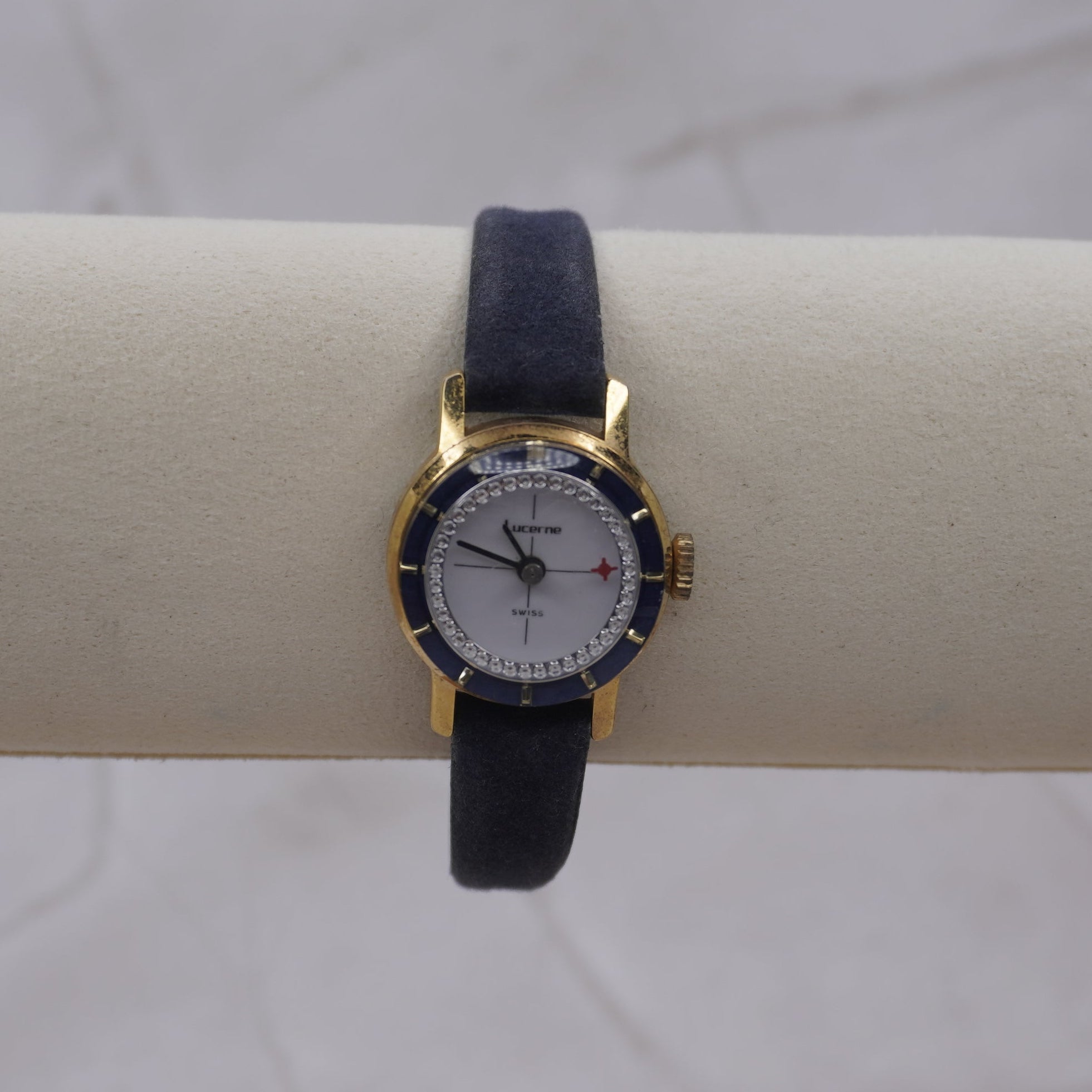 Vintage Lucerne Swiss Women’s Watch – Gold Tone Case, Blue Bezel, Leather Strap, Small Dial – Classic Retro Swiss Timepiece