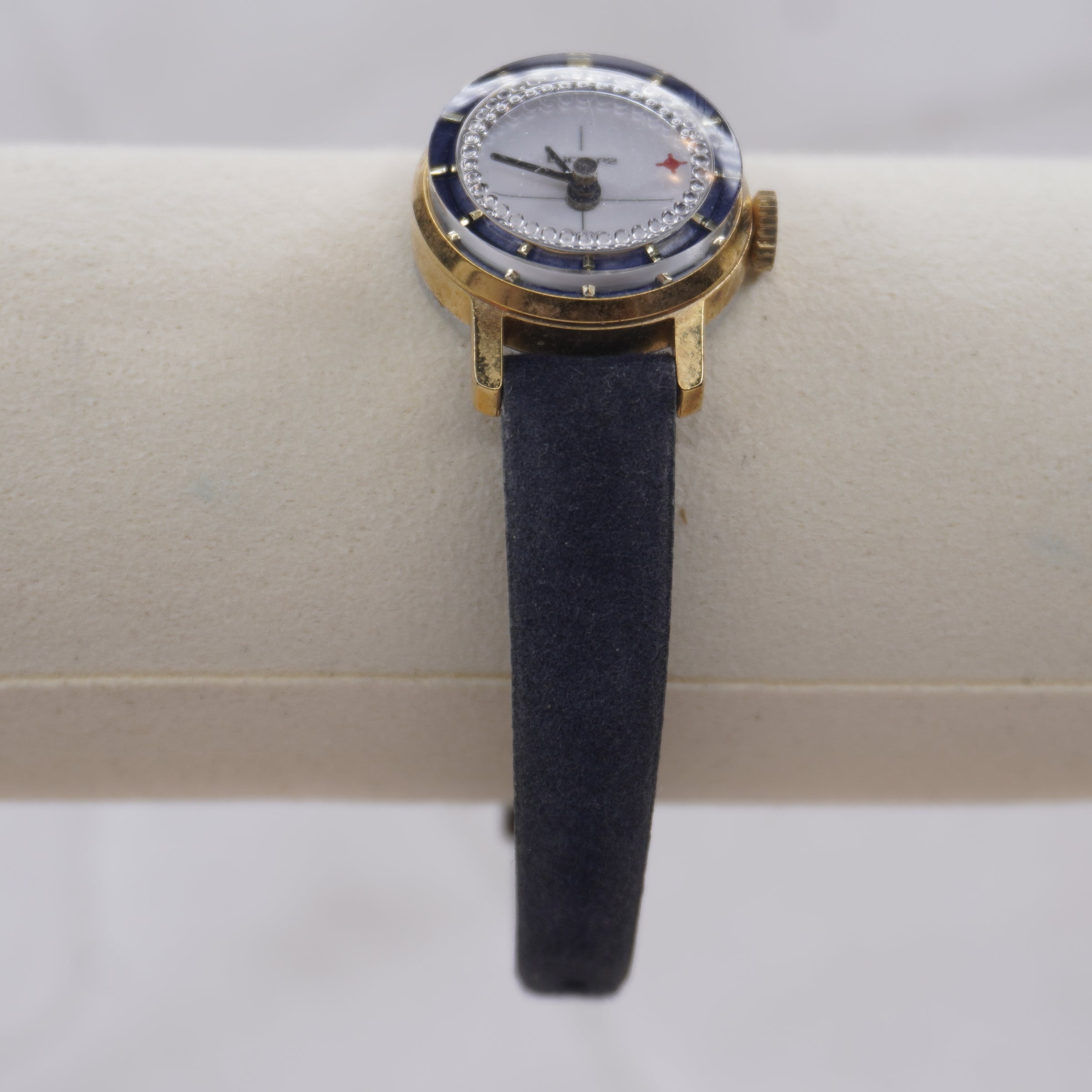 This vintage Lucerne Swiss women’s watch is a beautiful small-dial timepiece featuring a gold-tone case, deep blue bezel accents, and a classic leather strap. Its minimalist dial, accented with a signature red marker, reflects Lucerne’s timeless Swiss design. This is a delicate, elegant watch ideal for collectors, vintage lovers, or anyone seeking a unique retro accessory.
