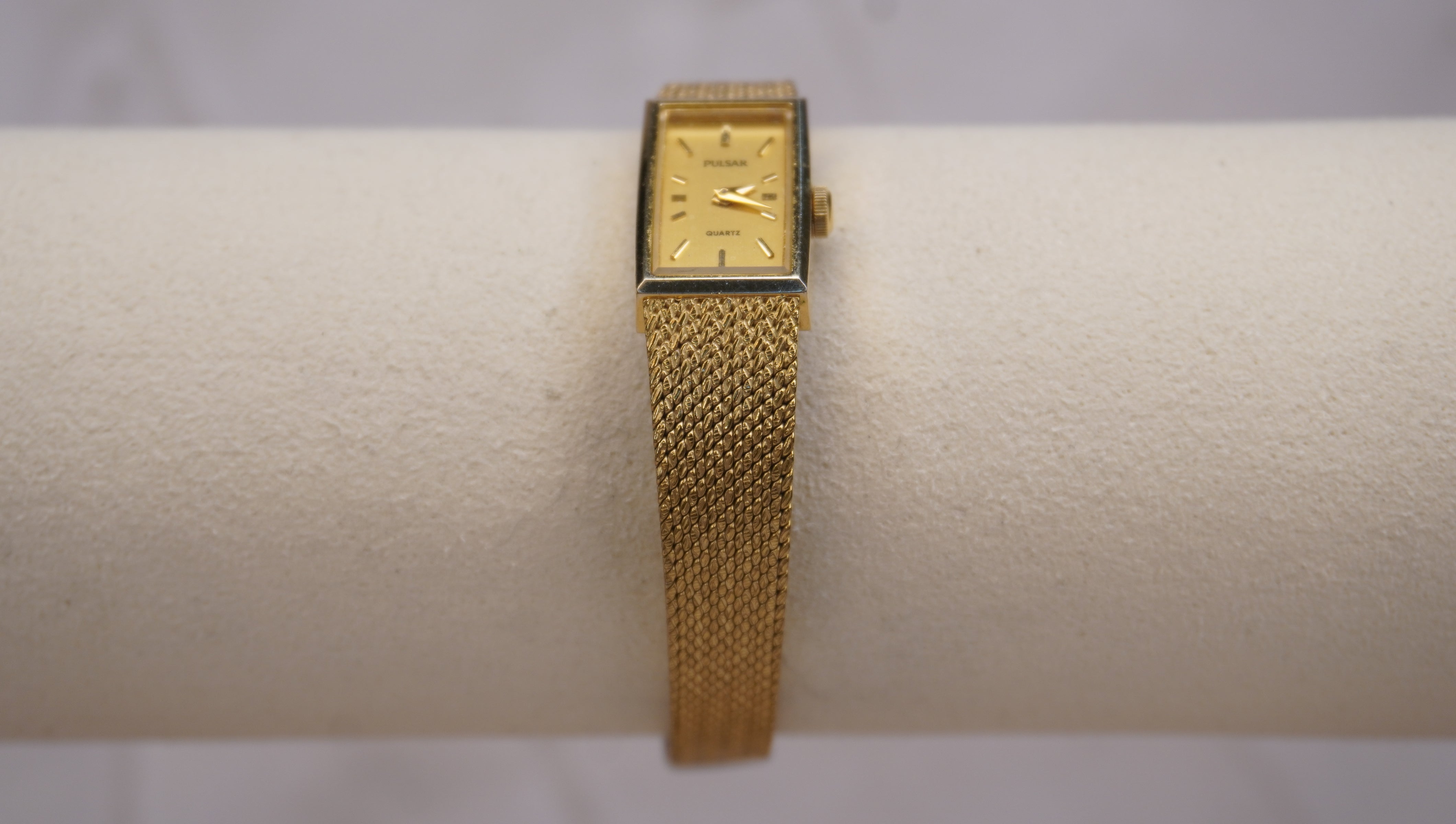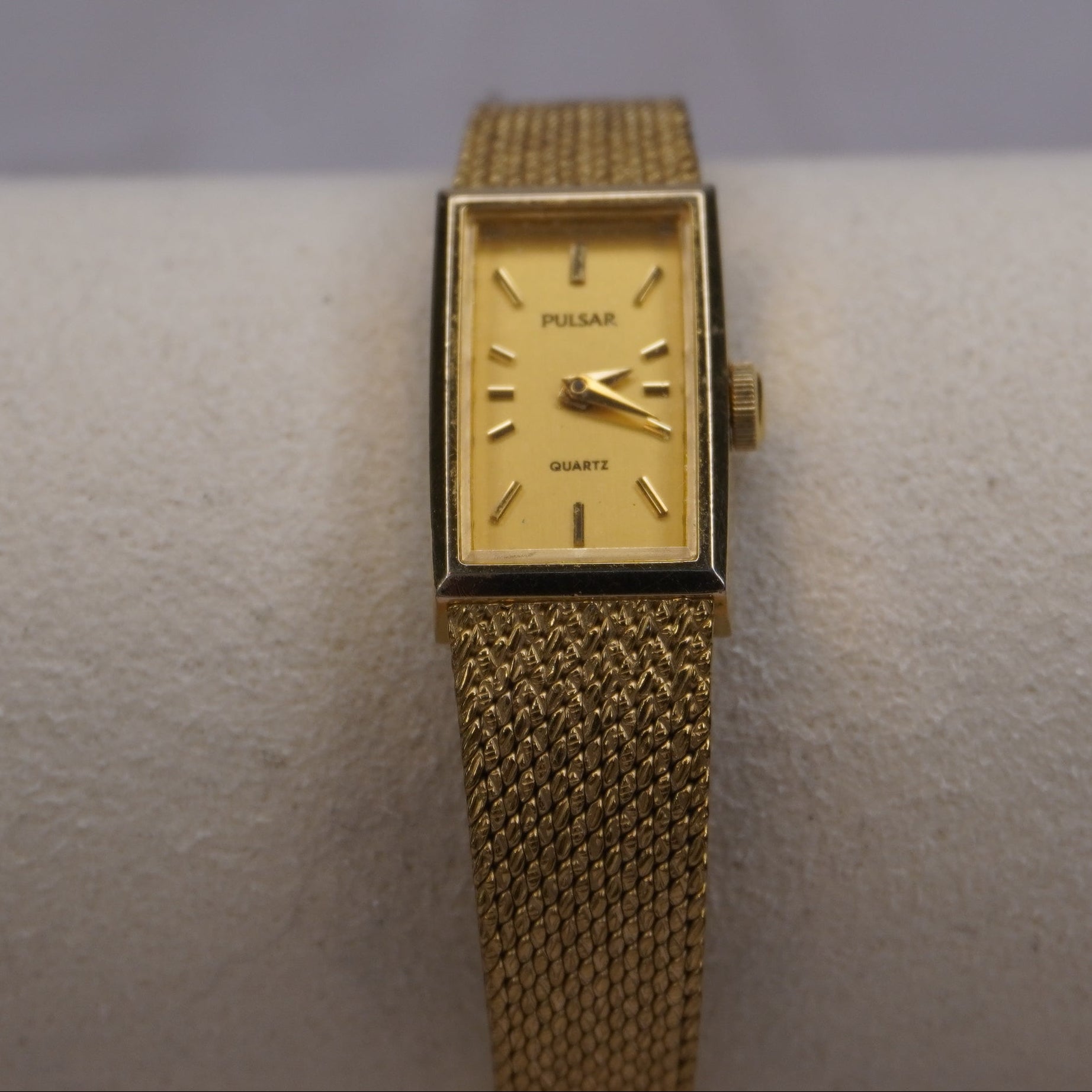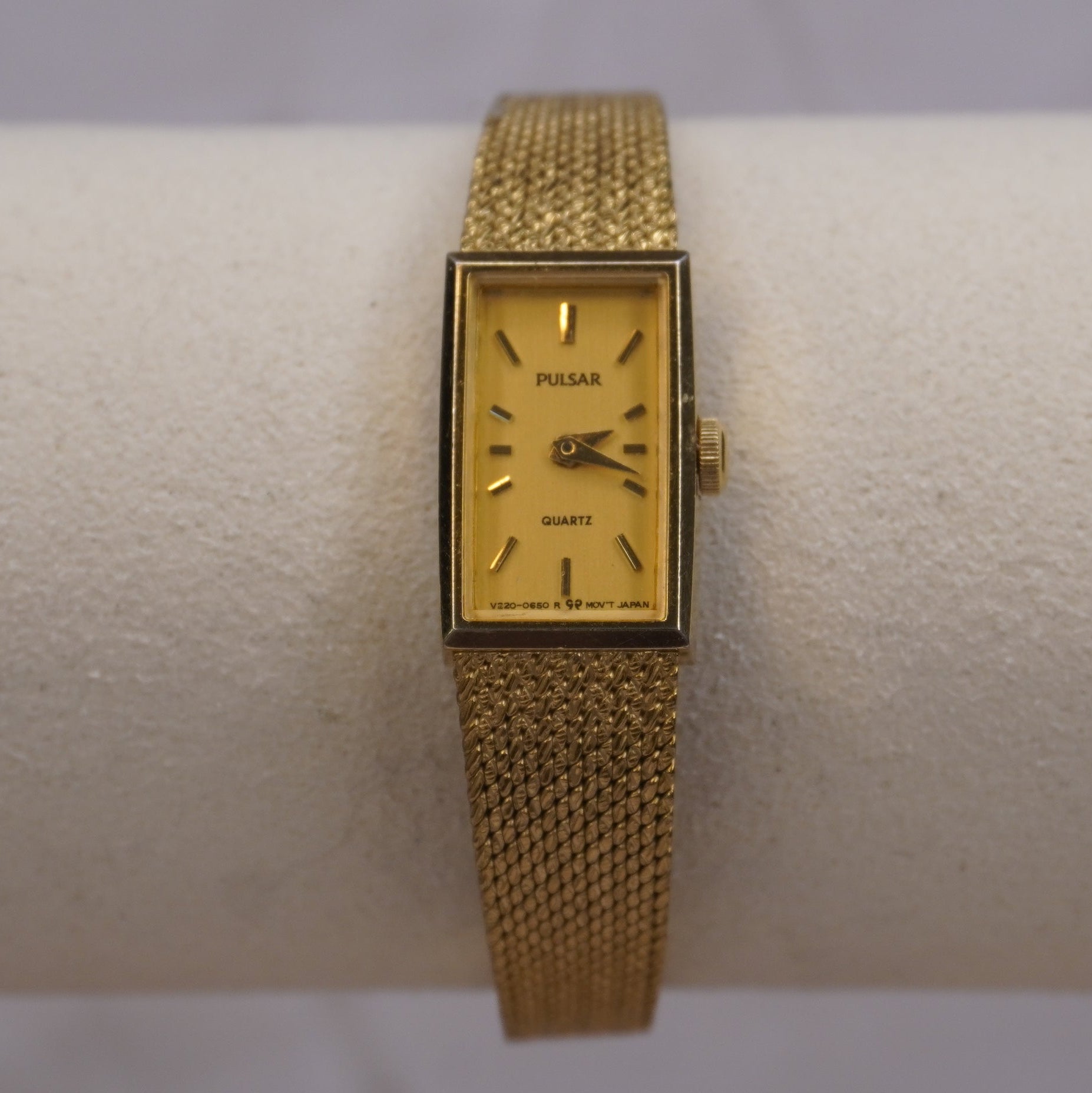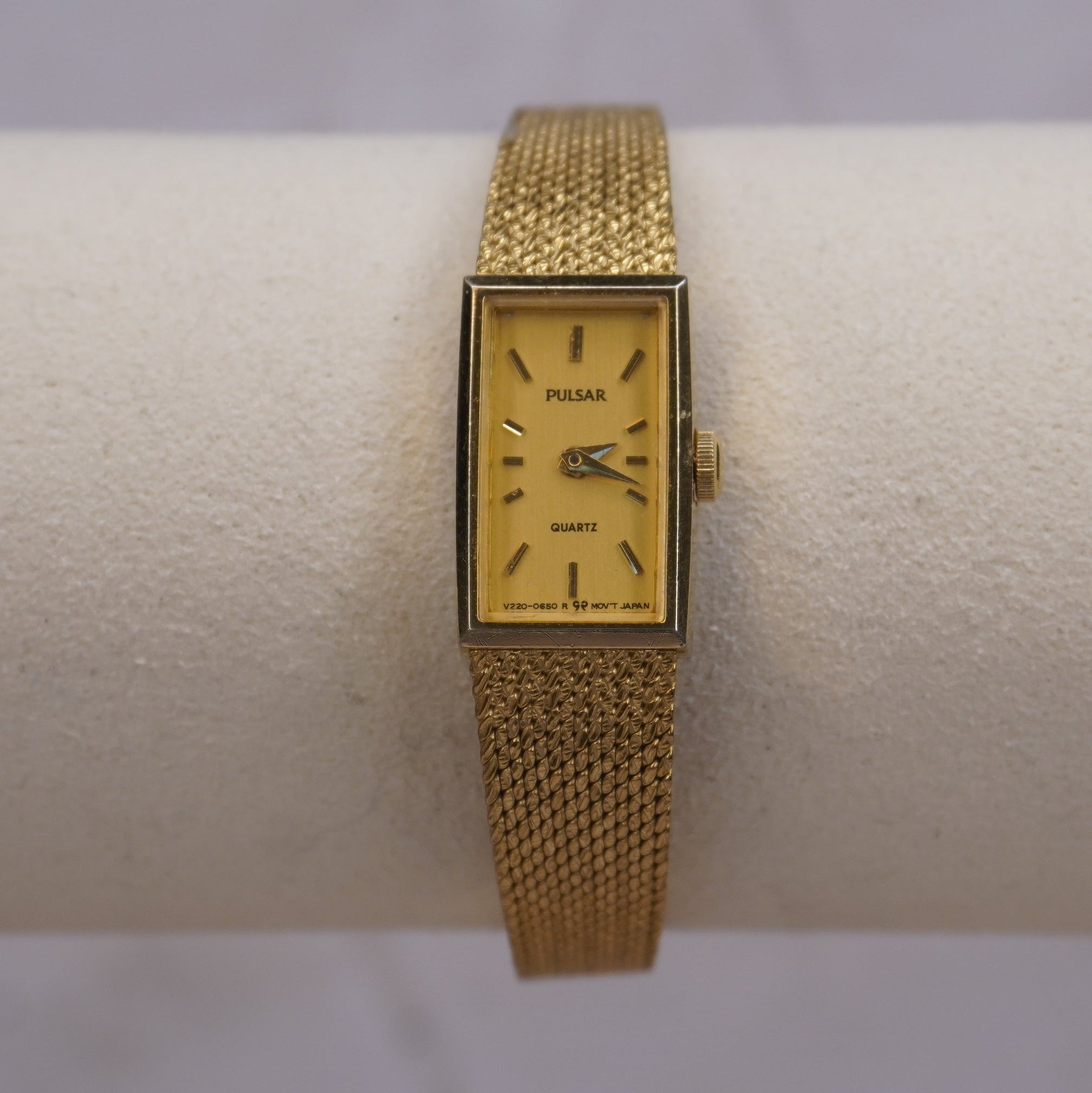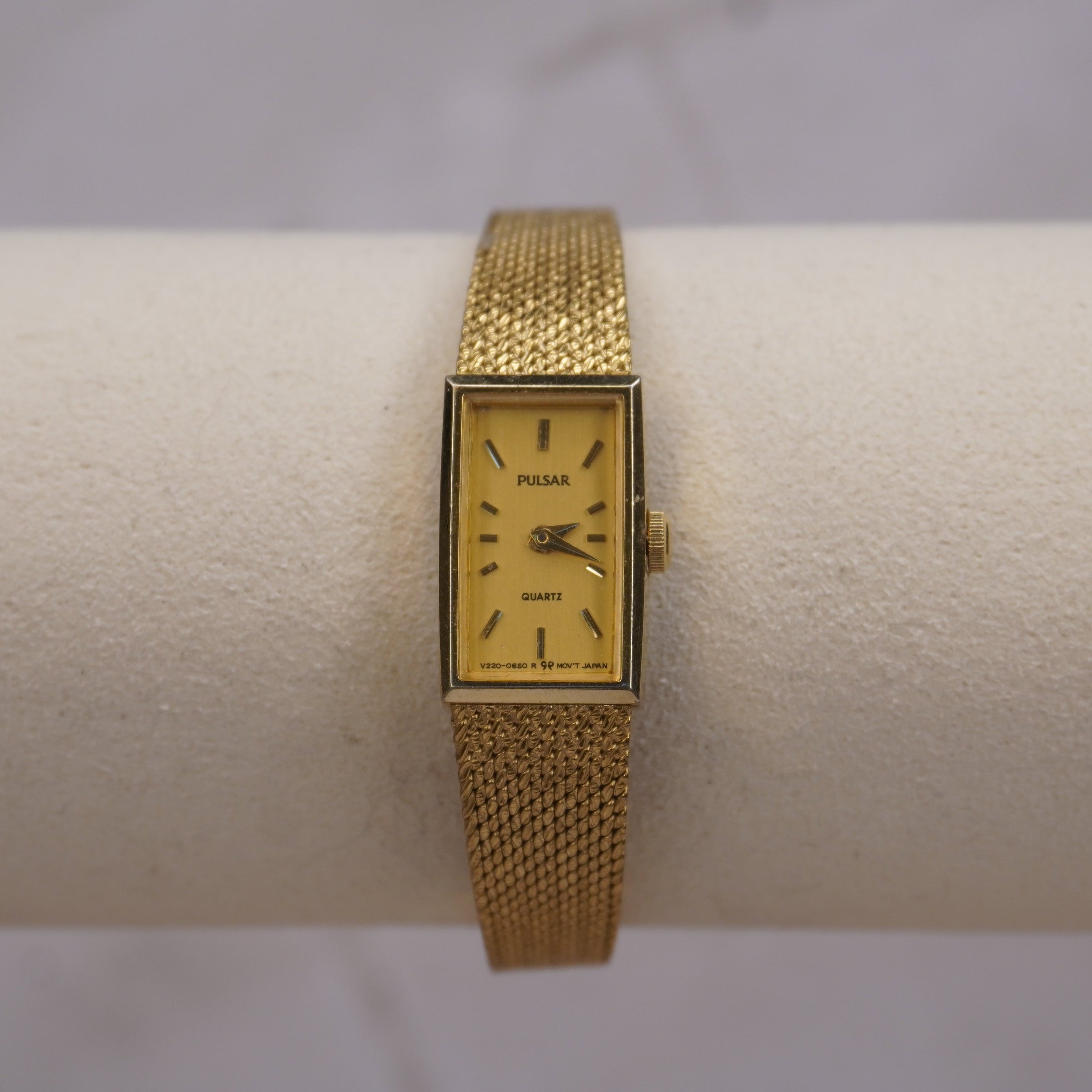 Vintage Pulsar Gold Mesh Women’s Watch | Rectangular Quartz Japan V220-0850 | Elegant Minimalist 1980s Style