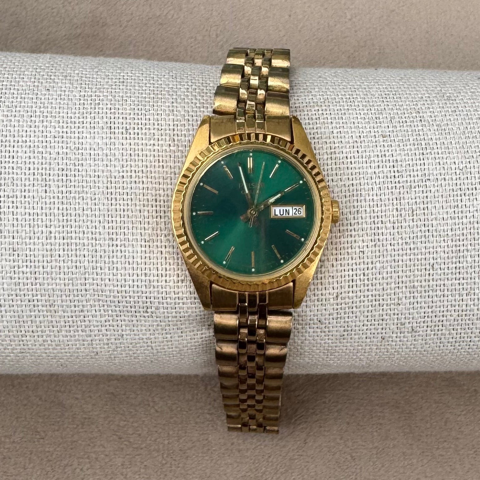 Emerald Elegance | Vintage Women’s Gold Watch with Green Dial & Day-Date Display