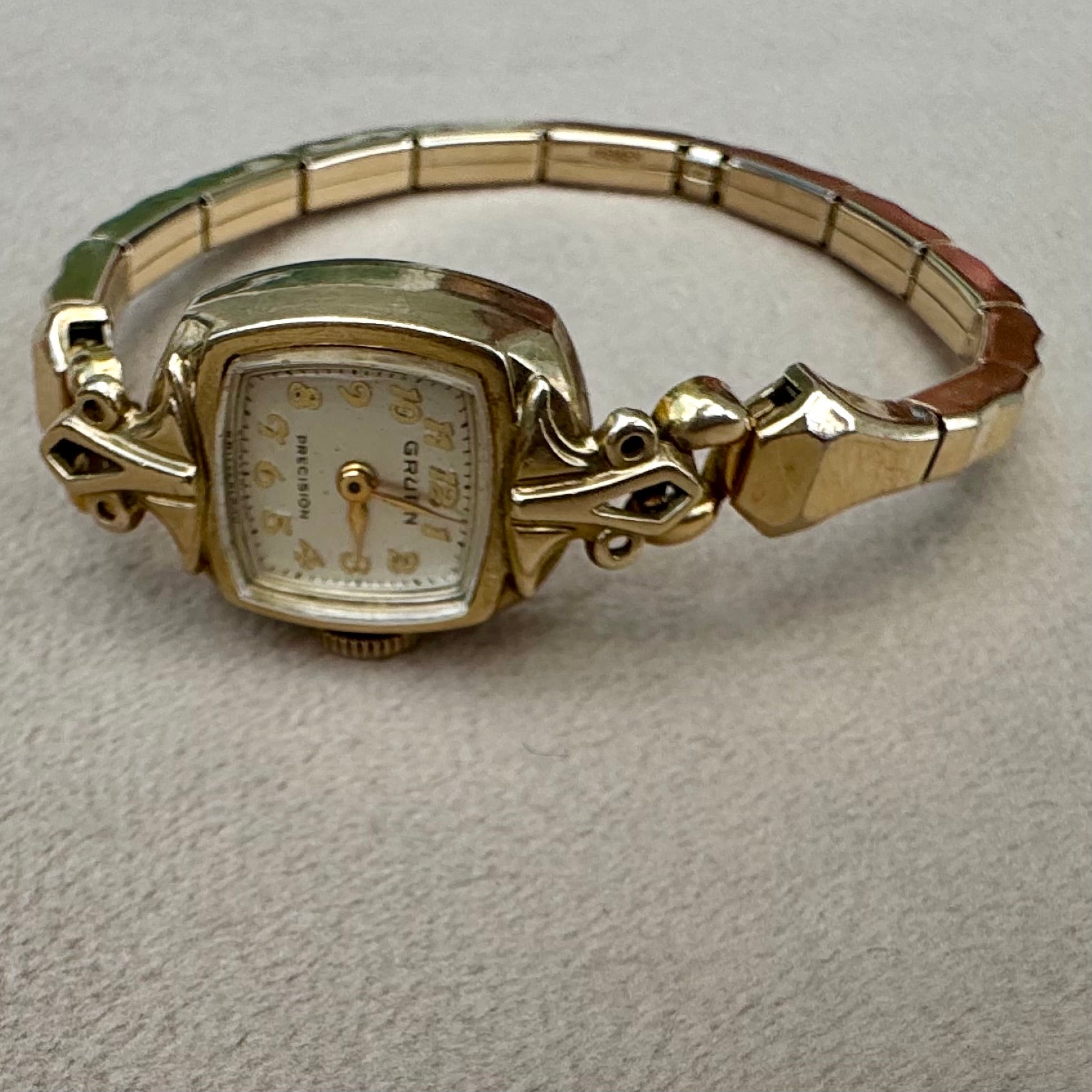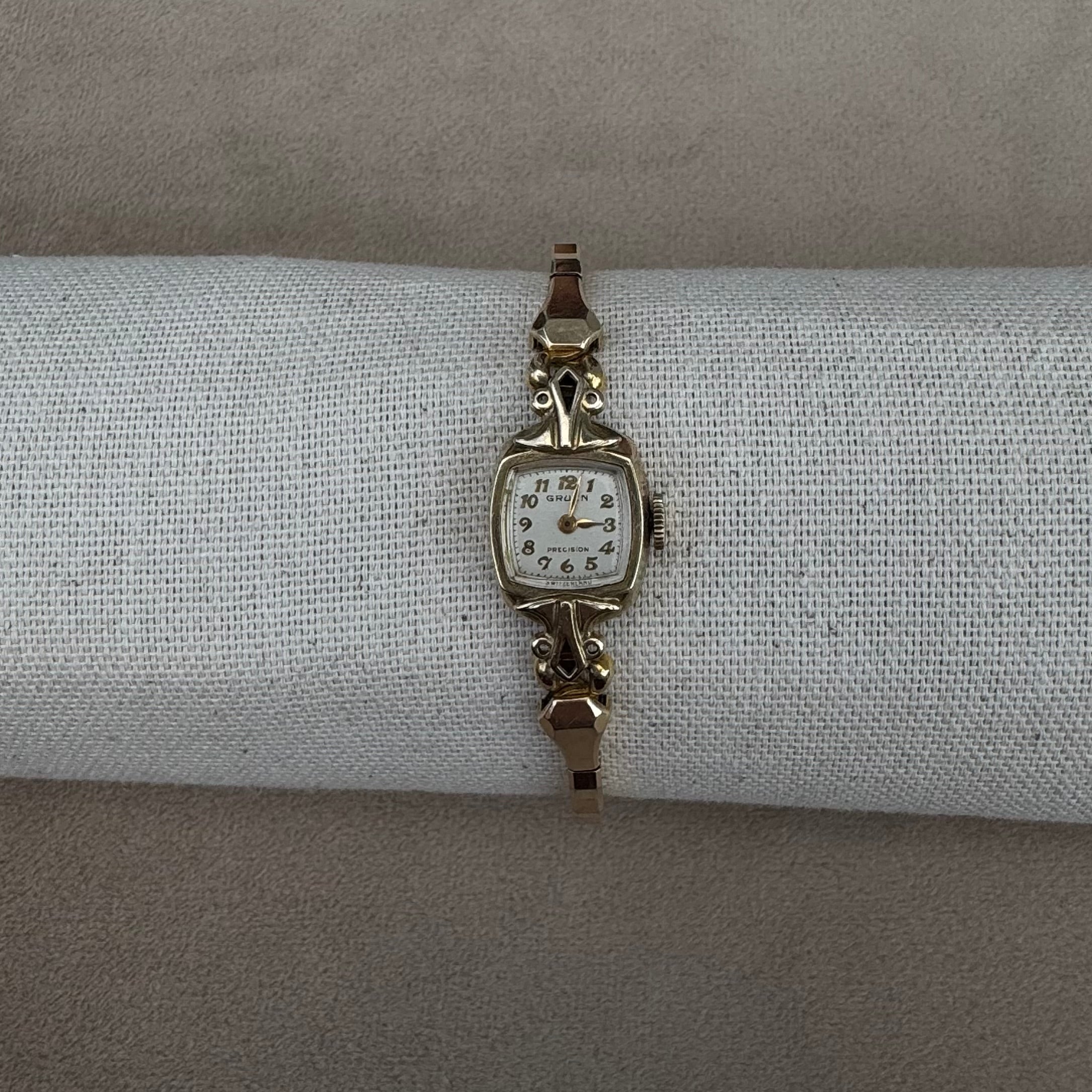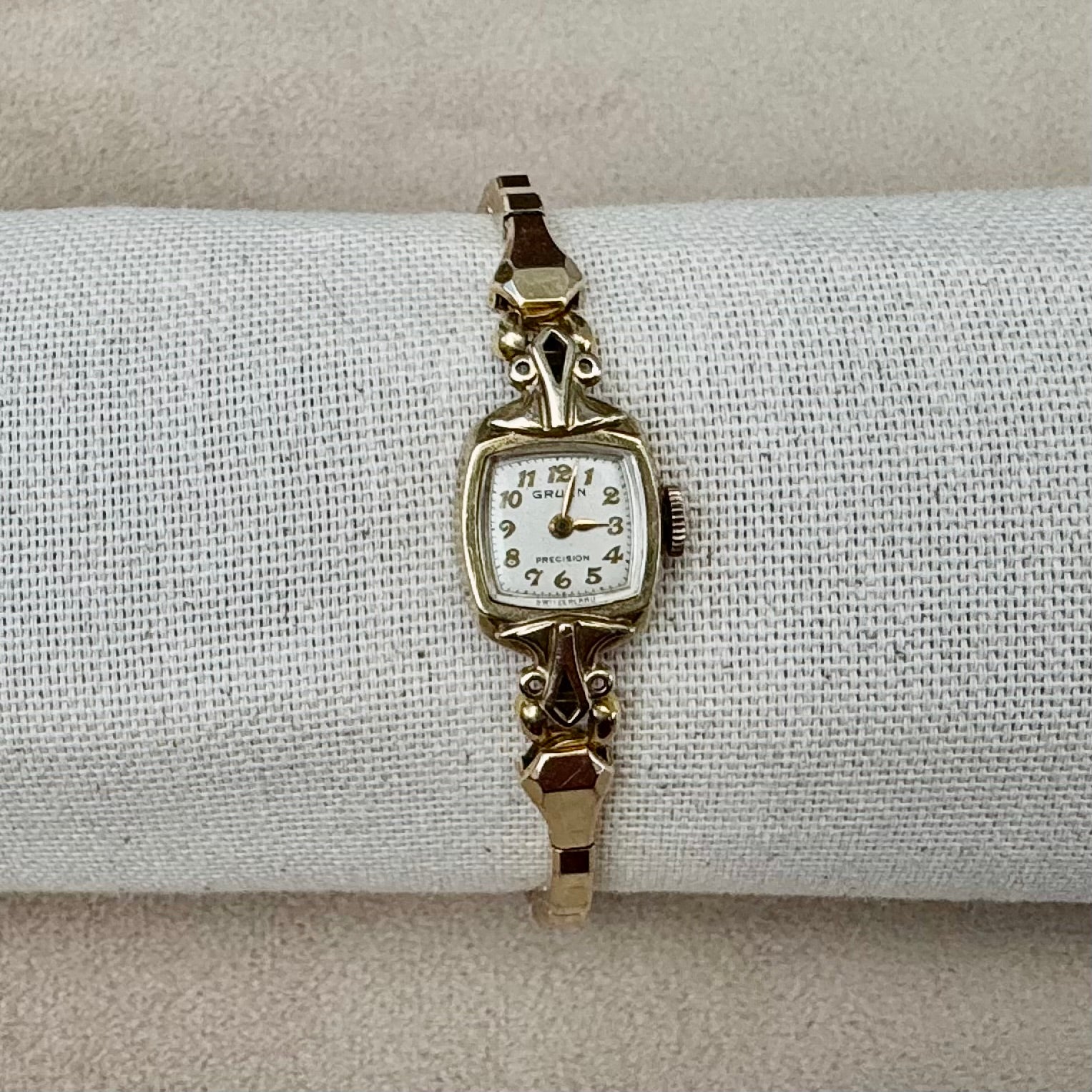 A timeless piece of American watchmaking history, this vintage Gruen Veri-Thin Precision wristwatch exudes classic 1940s–1950s elegance. Featuring a 10K gold-filled case and ornate Art Deco–inspired bracelet, this dainty mechanical watch captures the refinement and craftsmanship that made Gruen an icon.