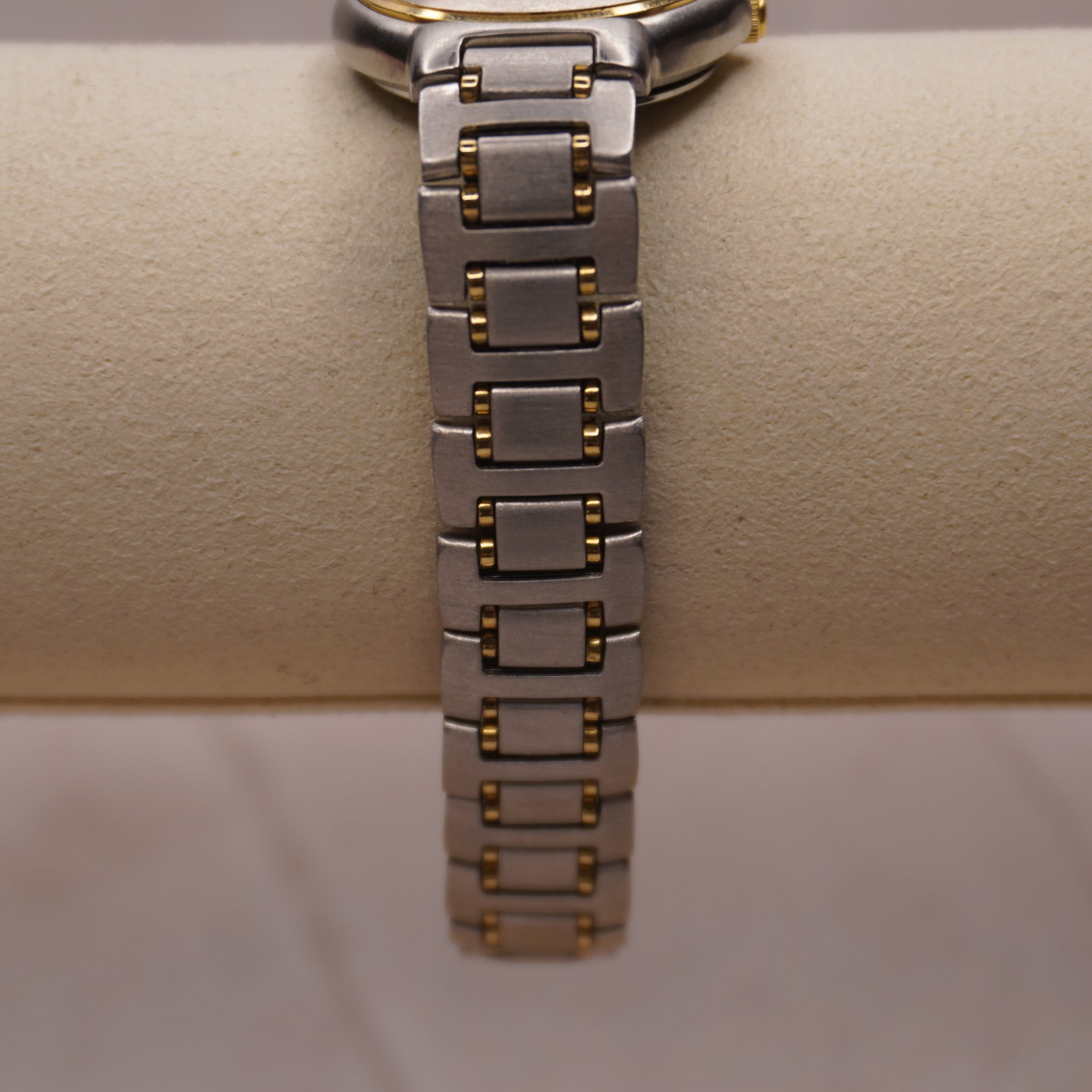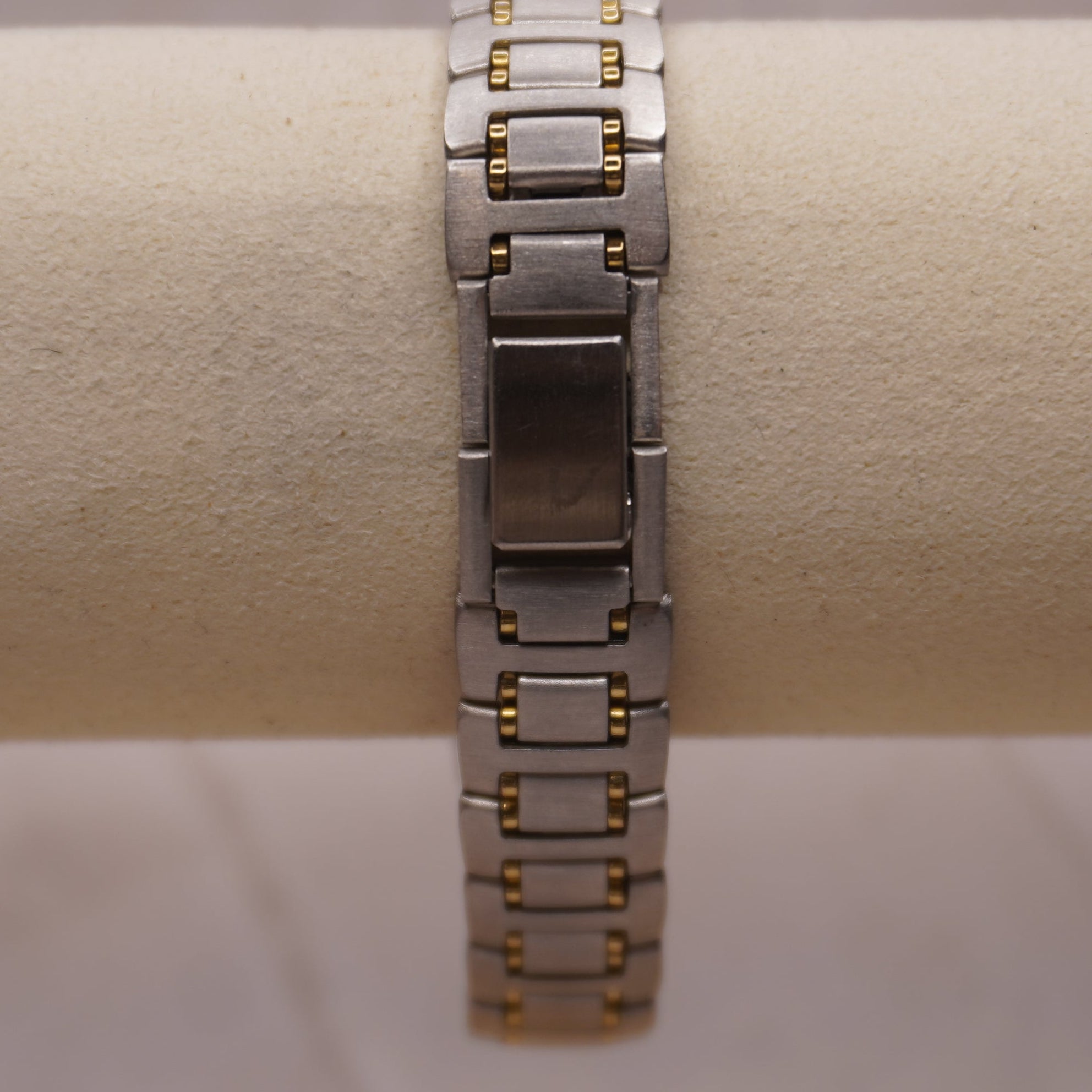 Band: Two-tone stainless steel bracelet with fold-over clasp