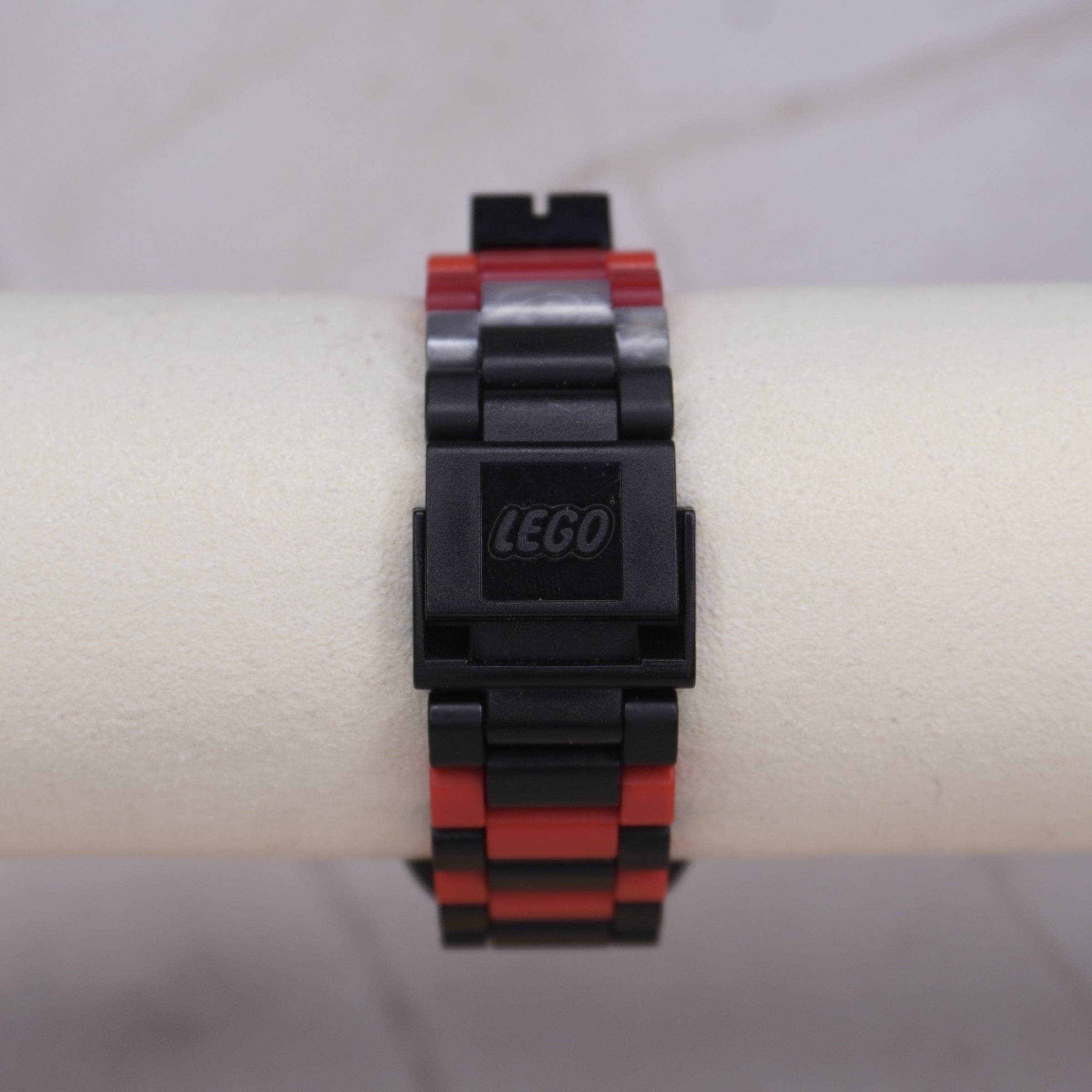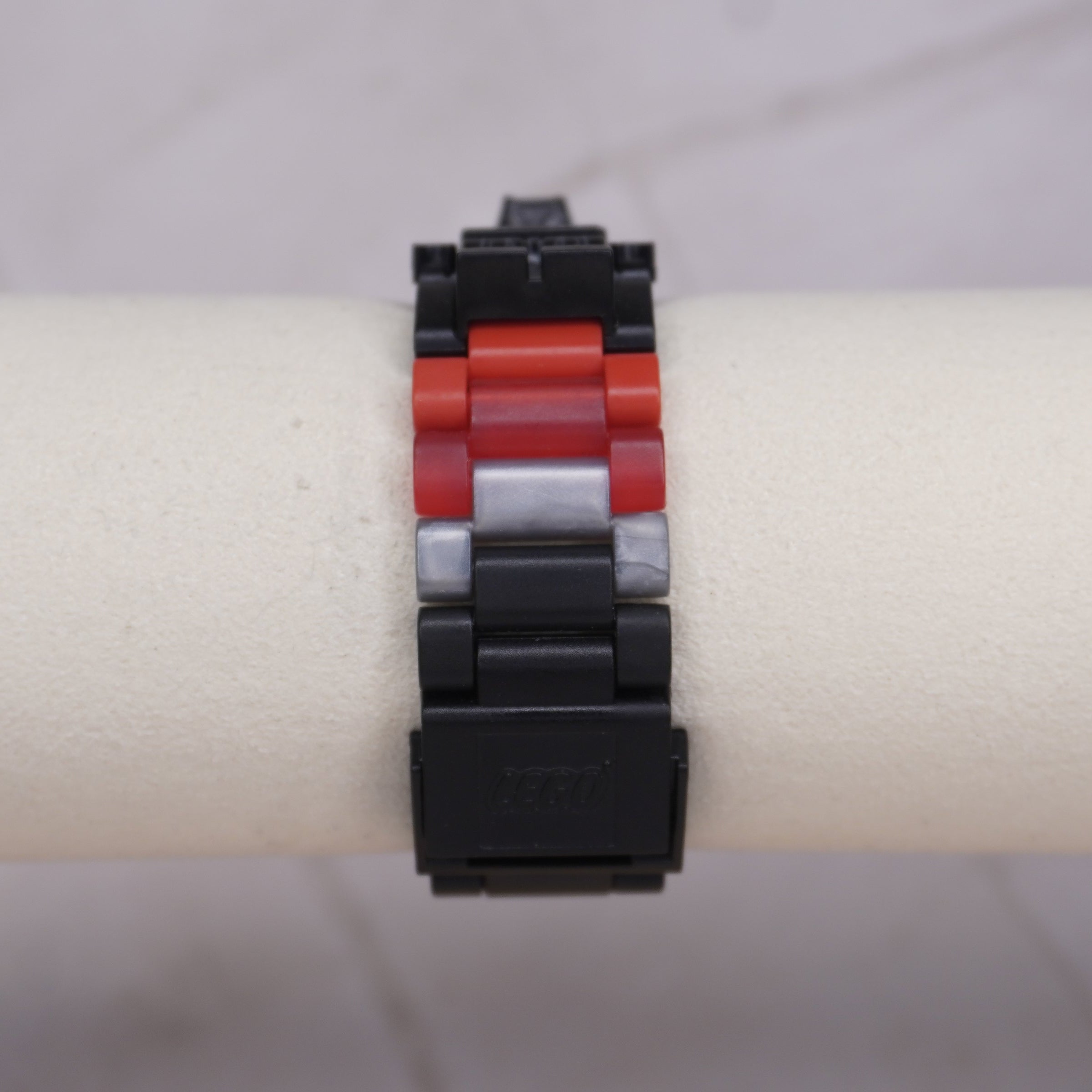 Band: Adjustable LEGO link-style bracelet (black, red, and gray pieces)