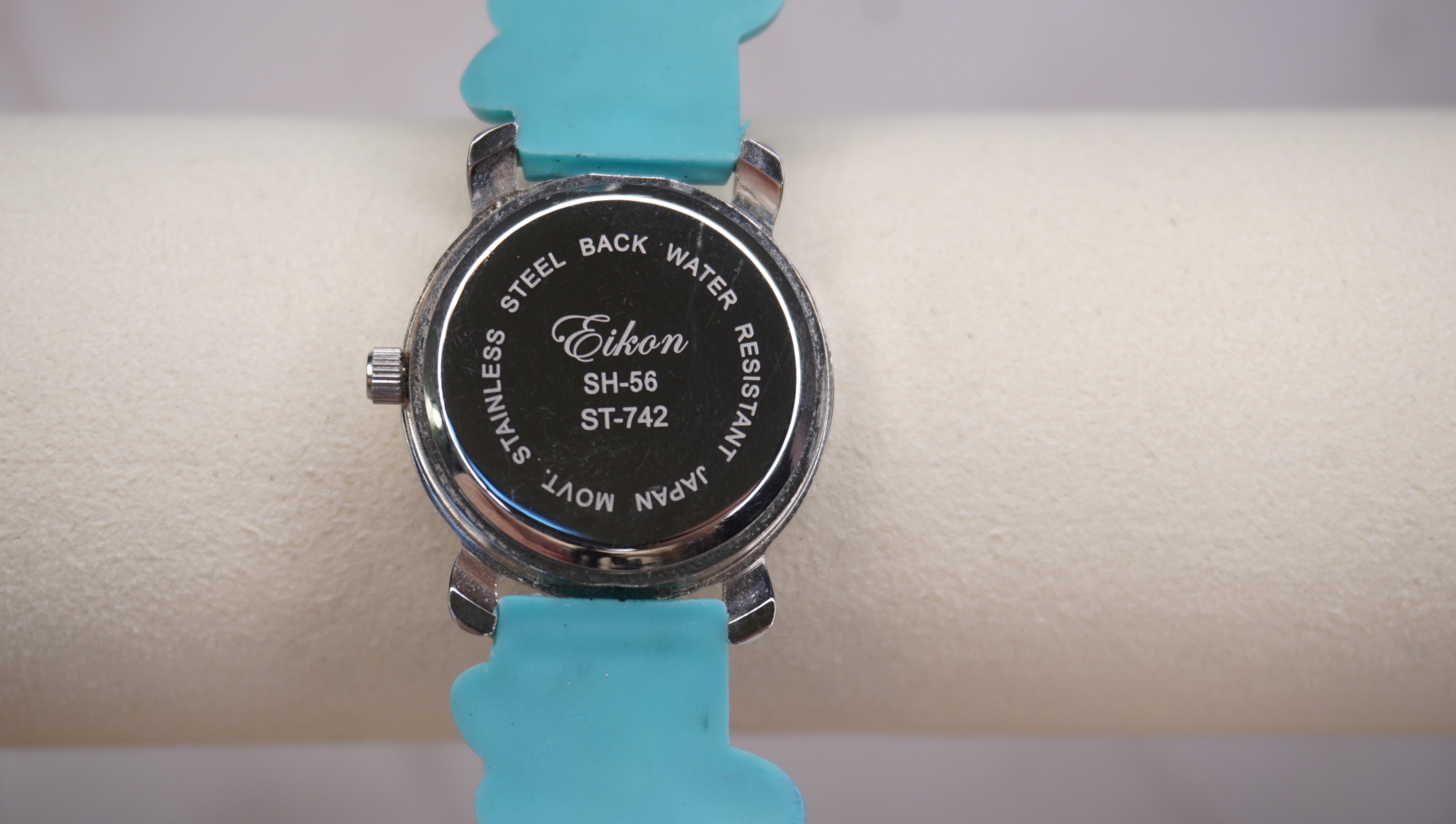 Whimsical and fun, this vintage Eikon quartz kids’ watch brings color and character to any outfit. With its turquoise band and raised dragonfly and flower designs, this timepiece adds a playful touch that children — and nostalgic collectors — will love.