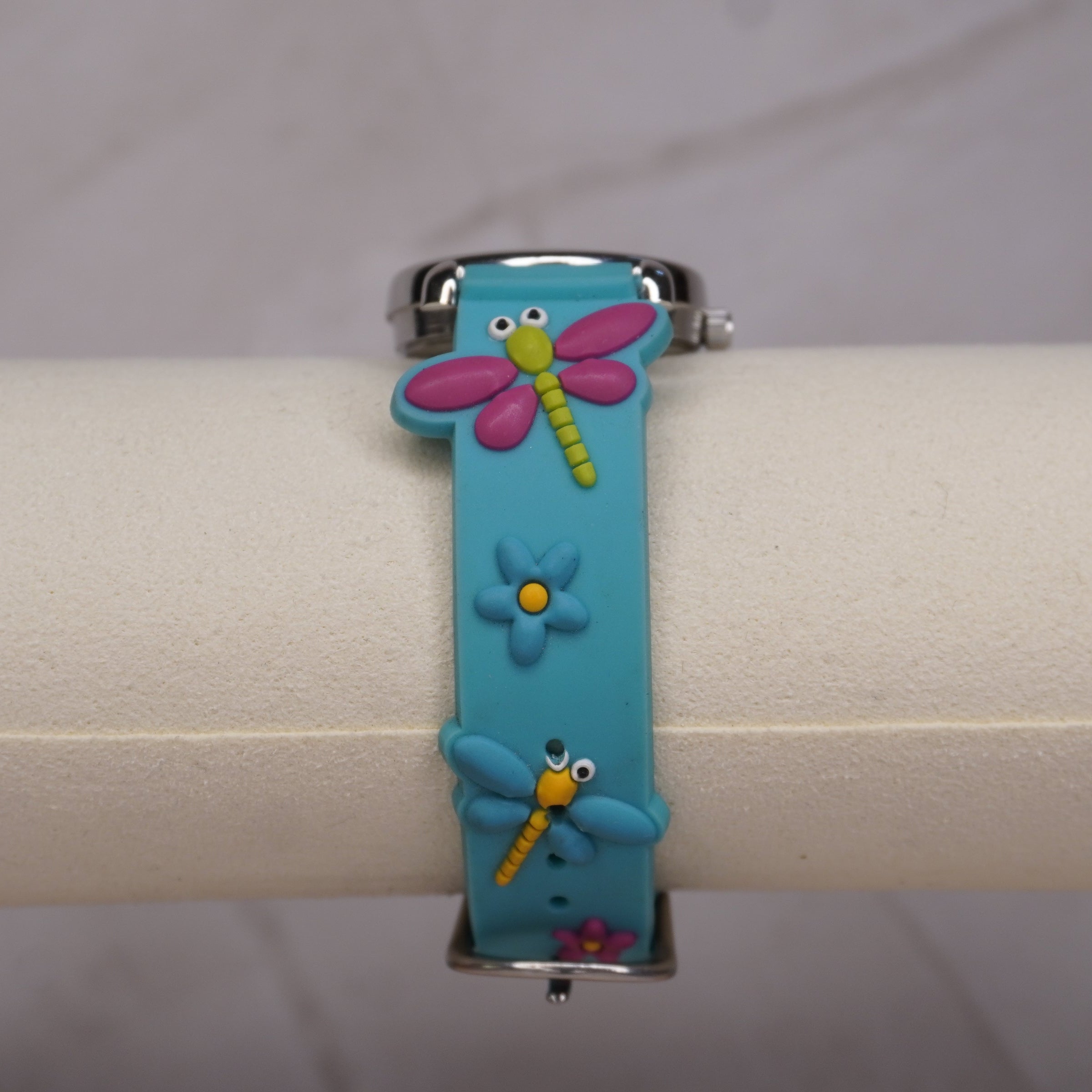Band: Bright turquoise silicone with 3D dragonfly and flower details