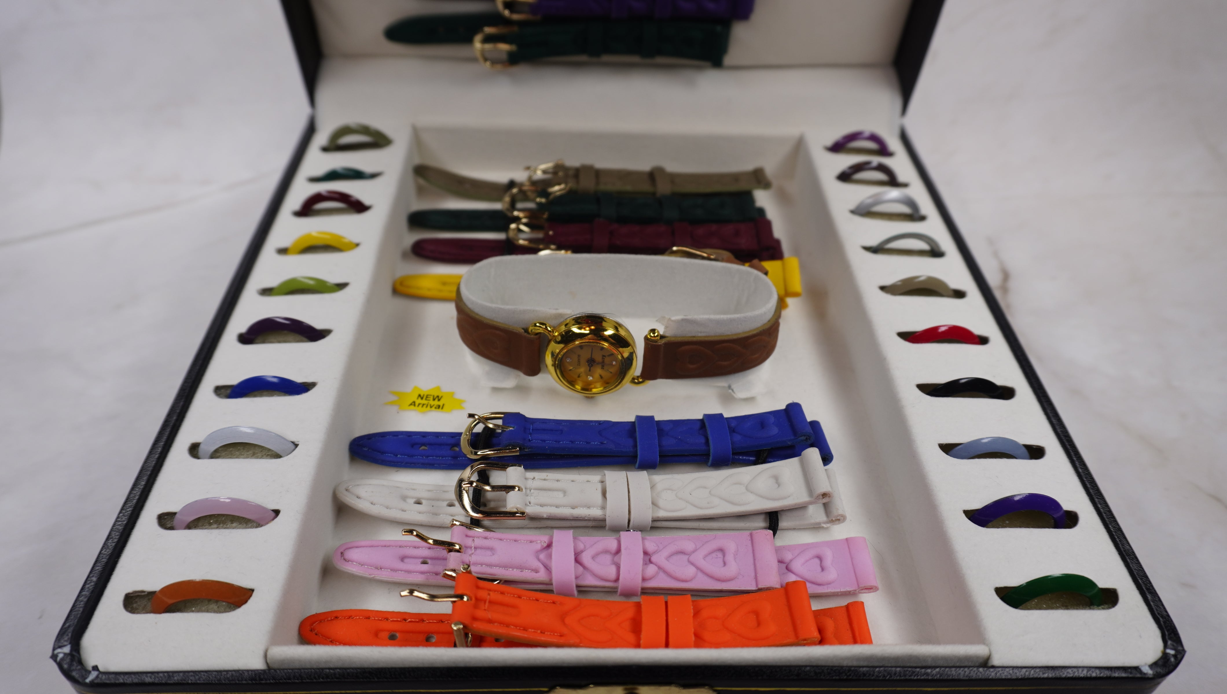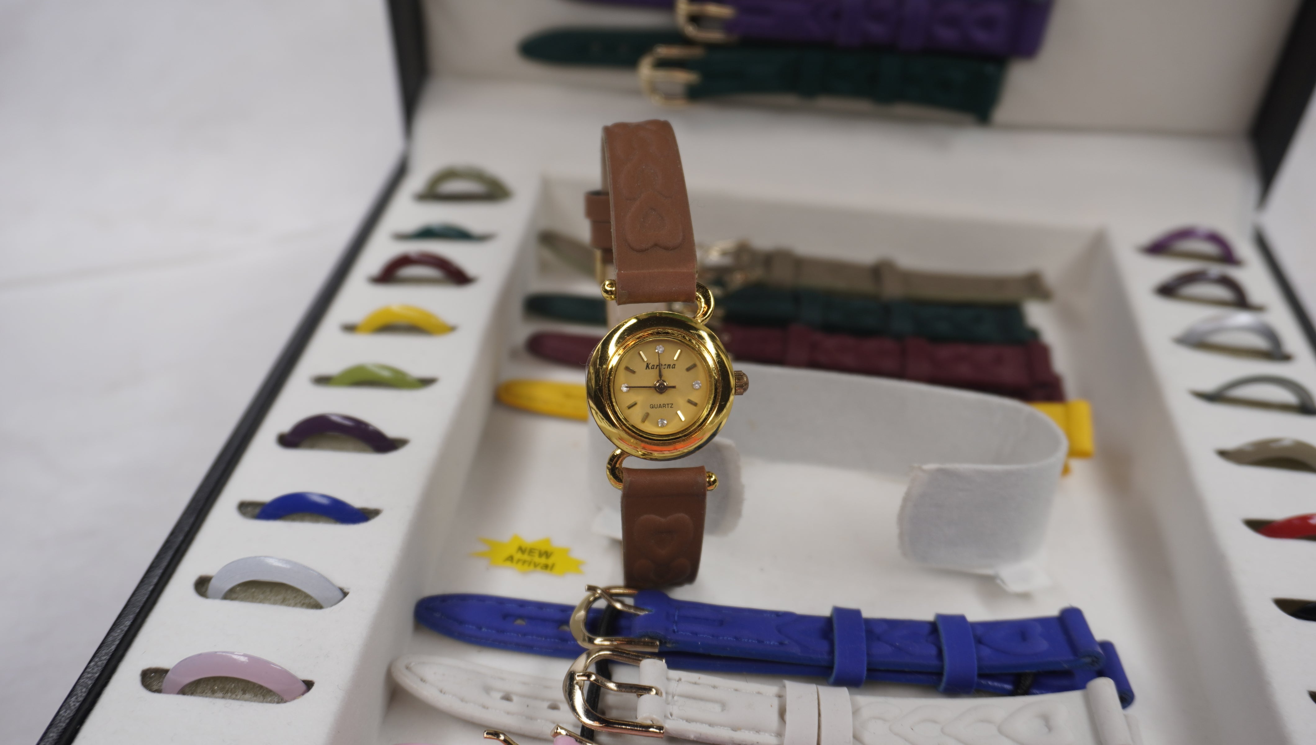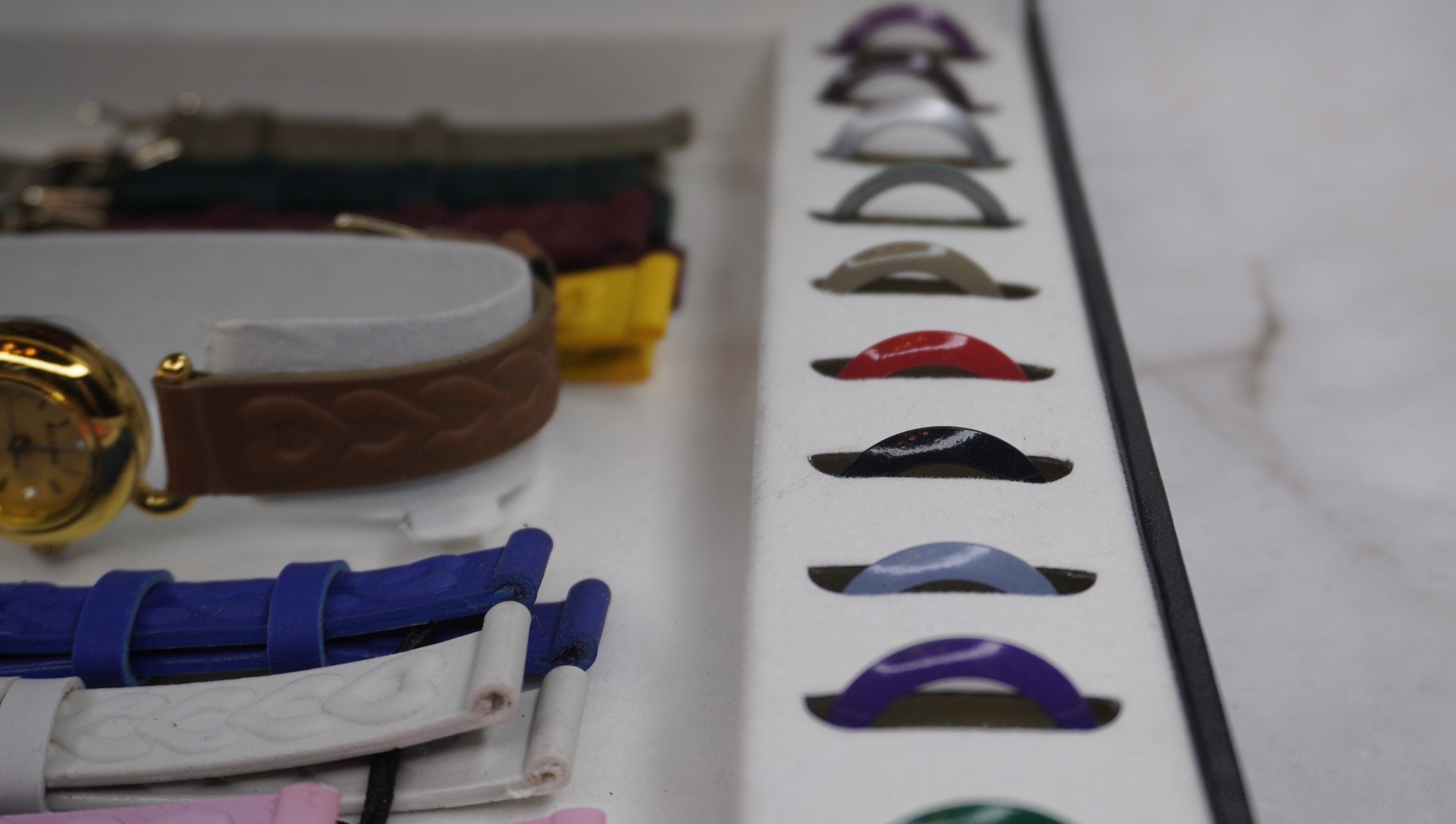 1990's Swiss Kareena Interchangeable Watch Set | 12 Color Bands + 12 Bezels | Gold-Tone Quartz Watch | Heart Design