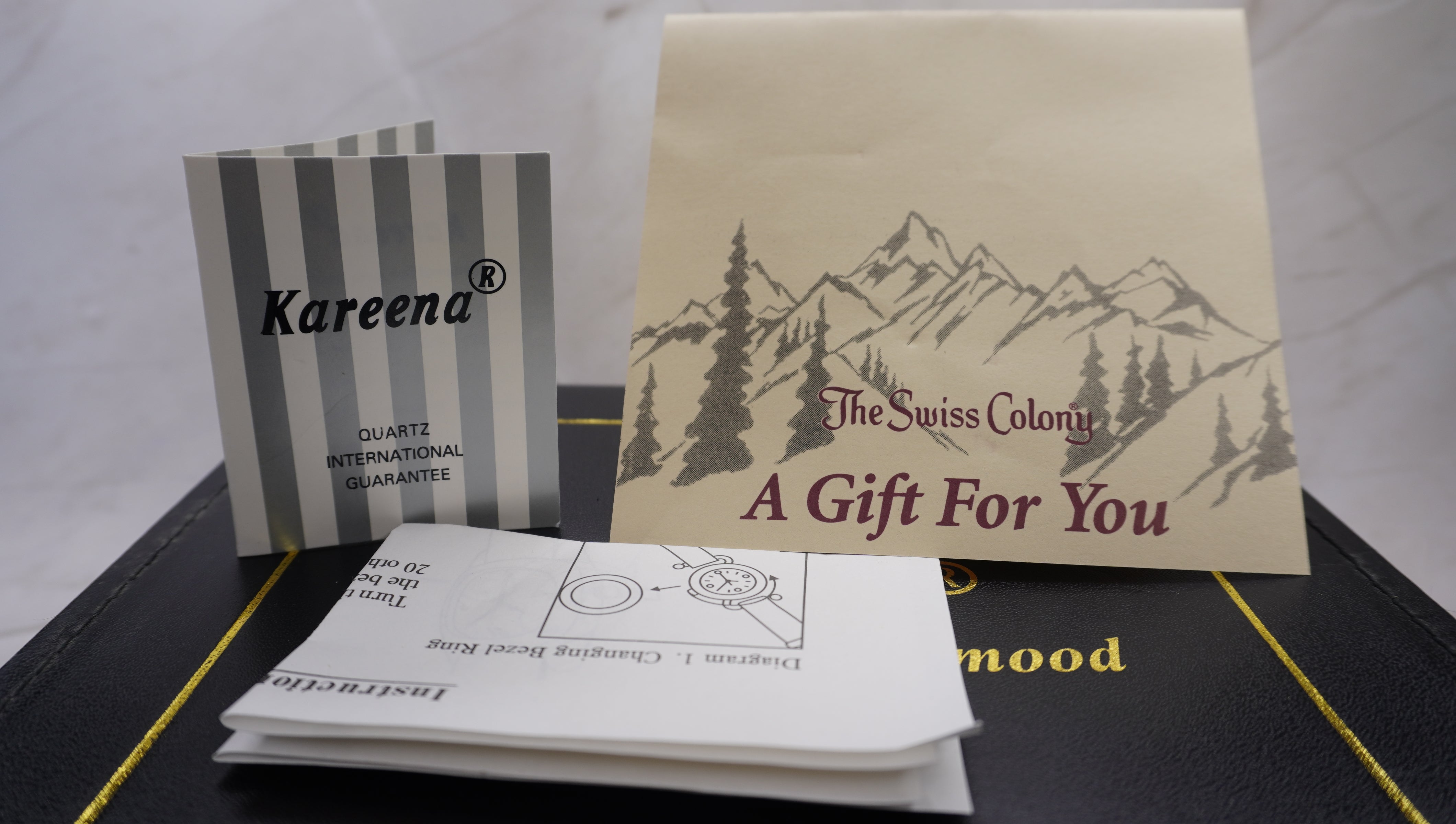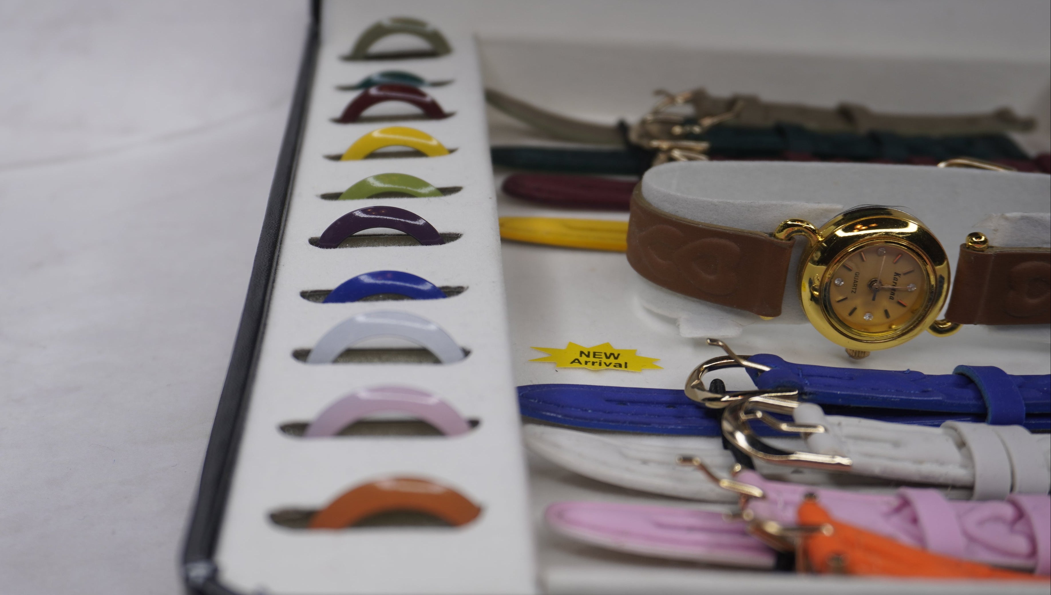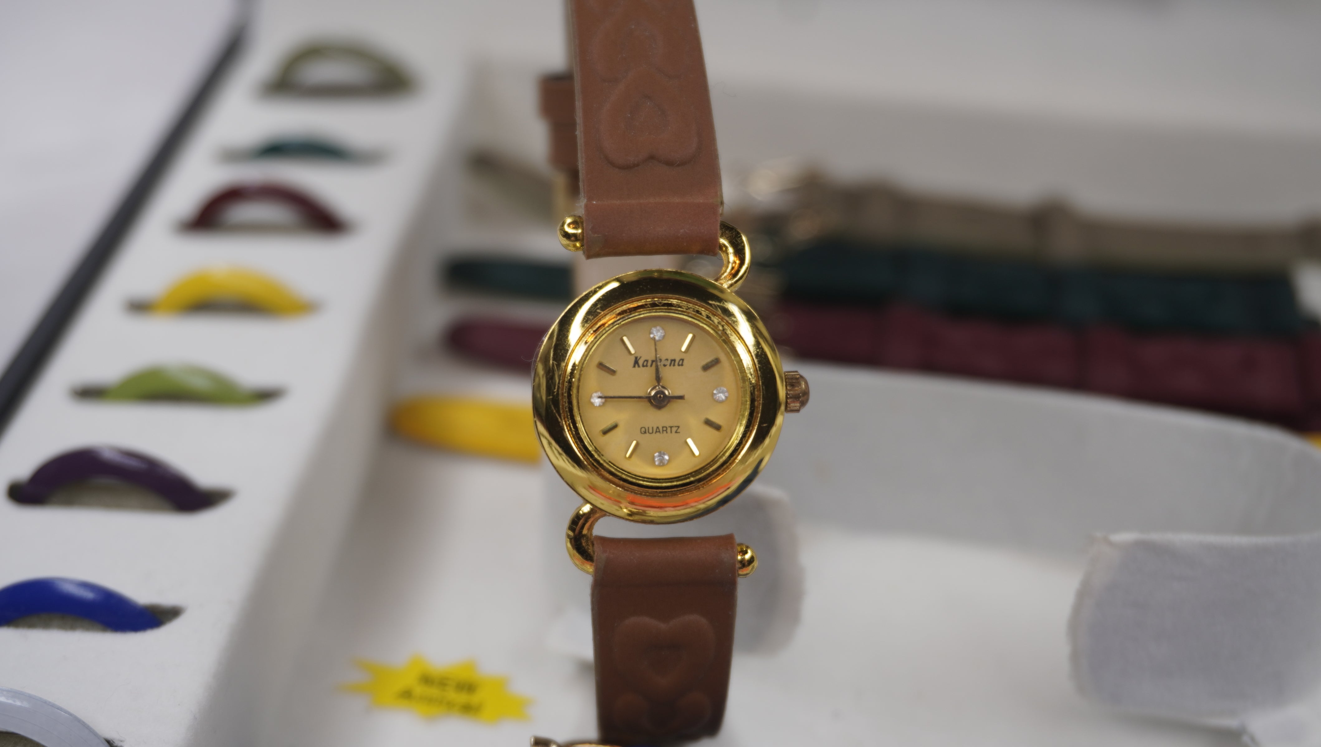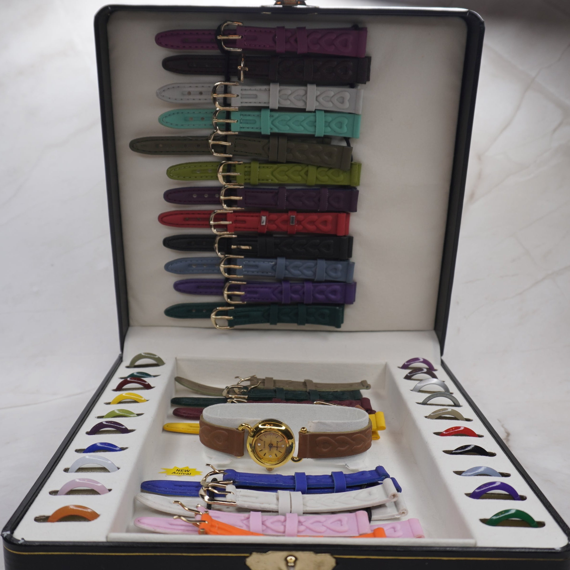 1990's Swiss Kareena Interchangeable Watch Set | 12 Color Bands + 12 Bezels | Gold-Tone Quartz Watch | Heart Design