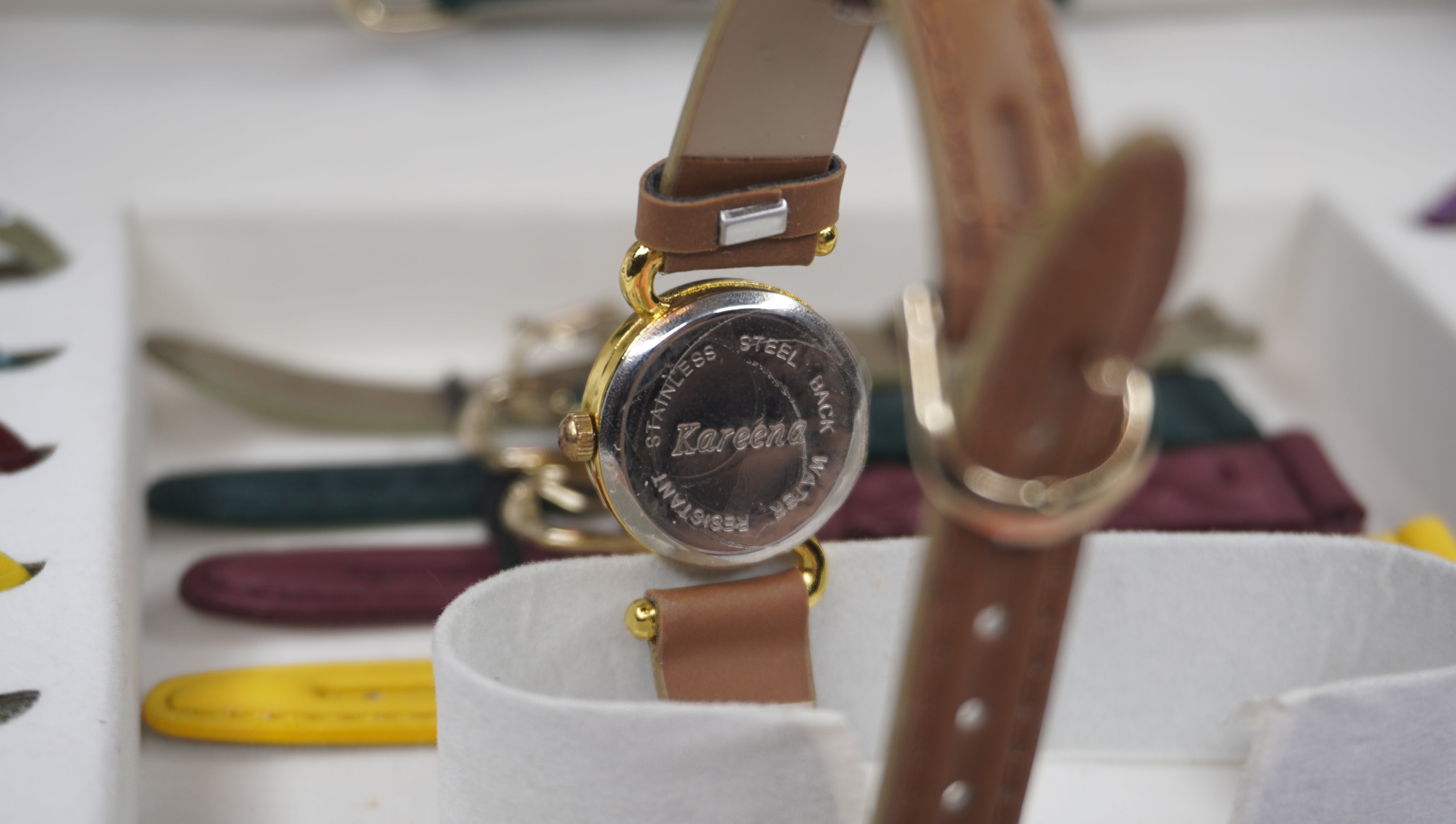 Beautiful and fun vintage-inspired Karvena interchangeable watch set, featuring a gold-tone quartz watch with 12 colorful bands and 12 matching bezels — perfect for coordinating with any outfit or mood.