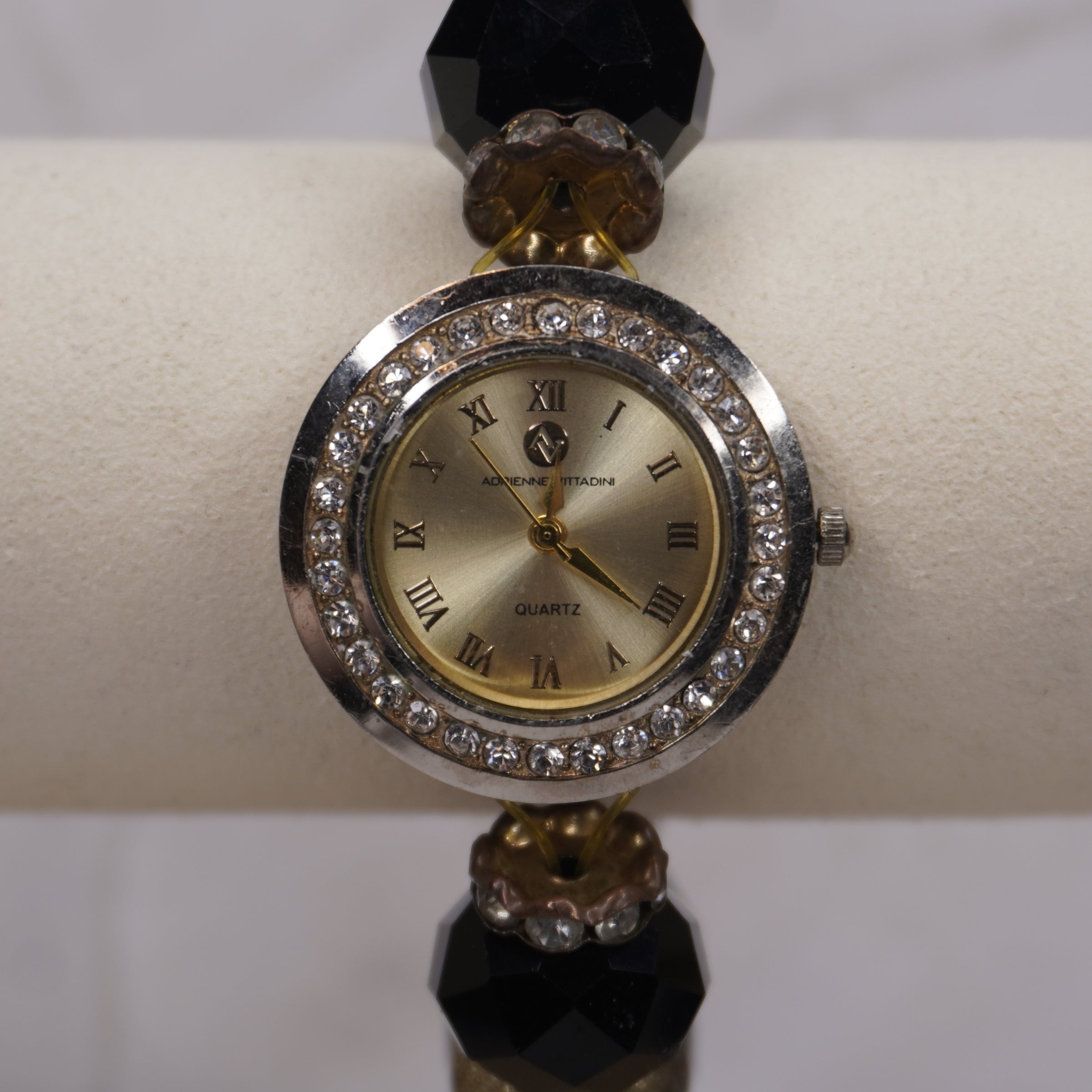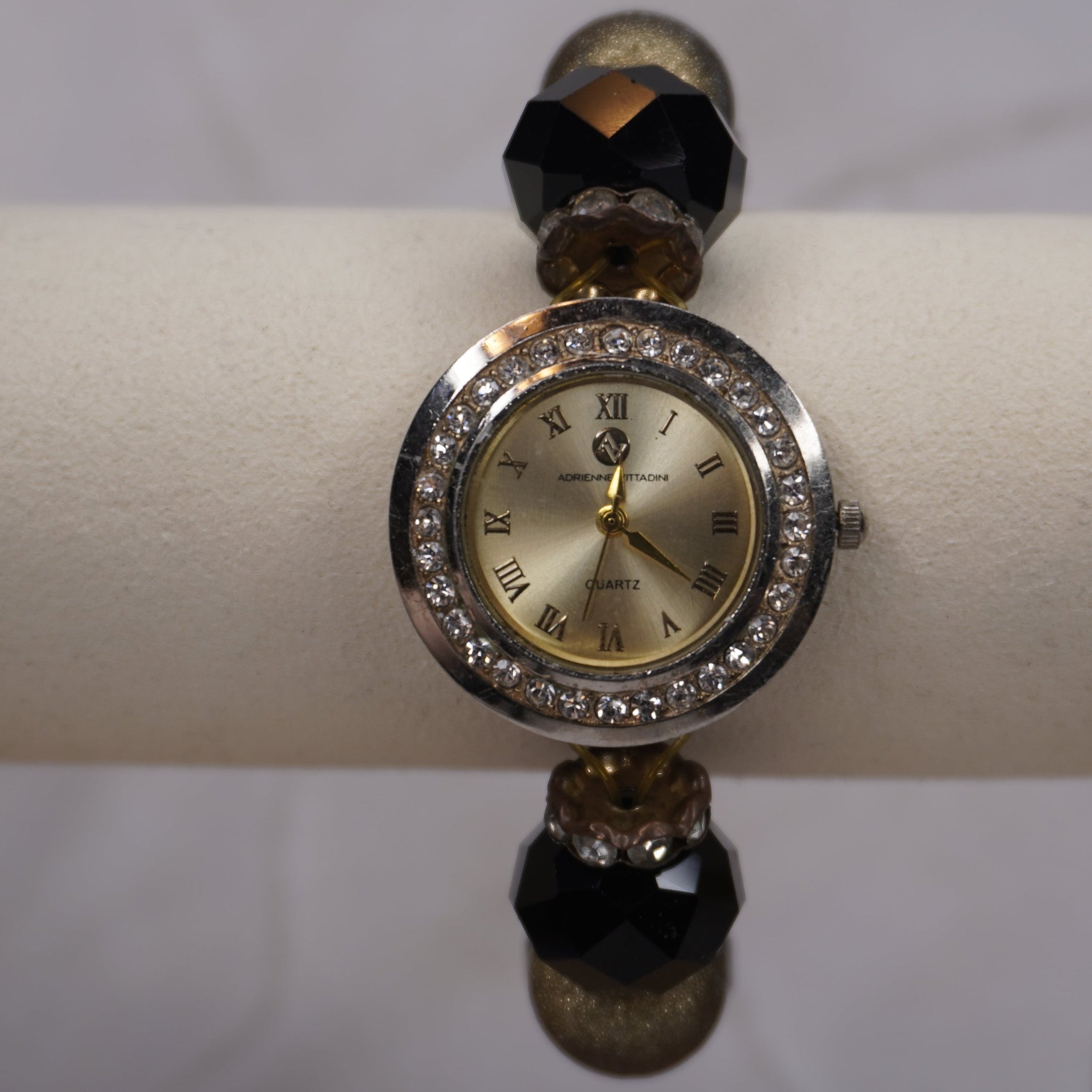 Make a bold statement with this stunning Adrienne Vittadini beaded stretch watch! Designed like a glamorous piece of jewelry, this quartz watch features a sparkling crystal-accented face, oversized faceted black beads, and luxe gold-tone accents. Itβs a showstopper that combines function and fashion effortlessly.