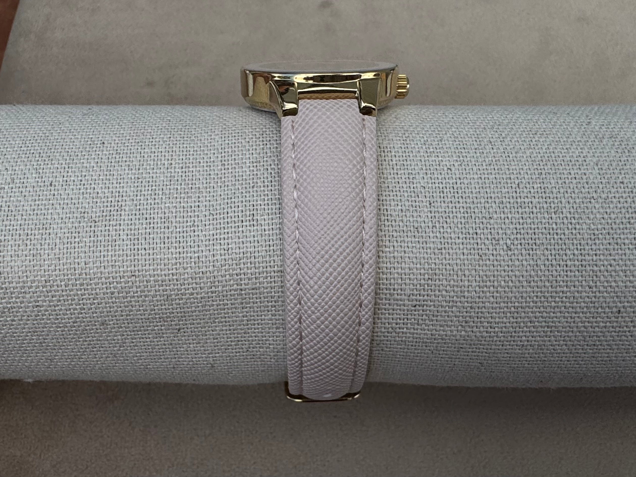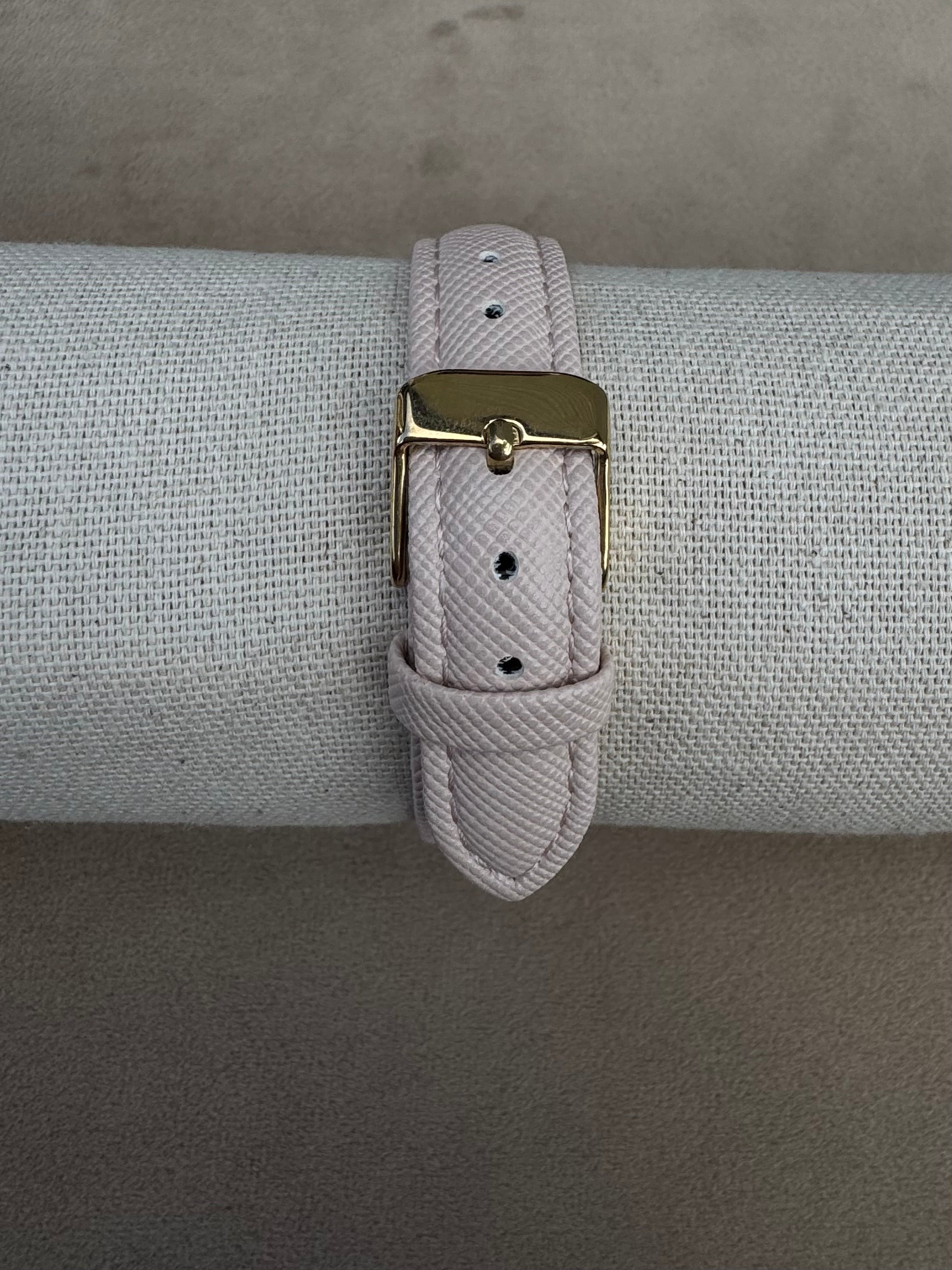 Band: Blush pink textured faux leather strap with gold buckle closure