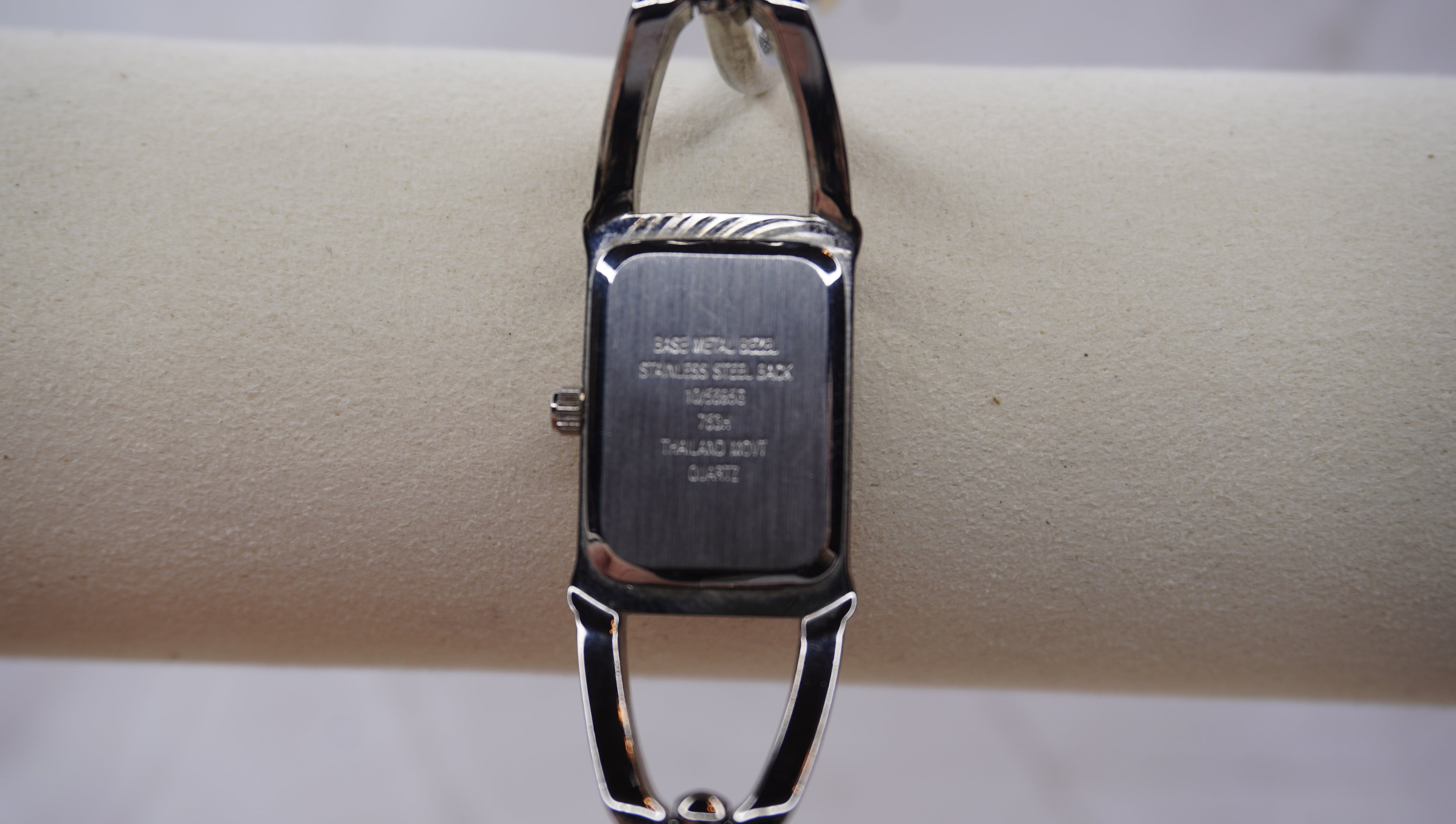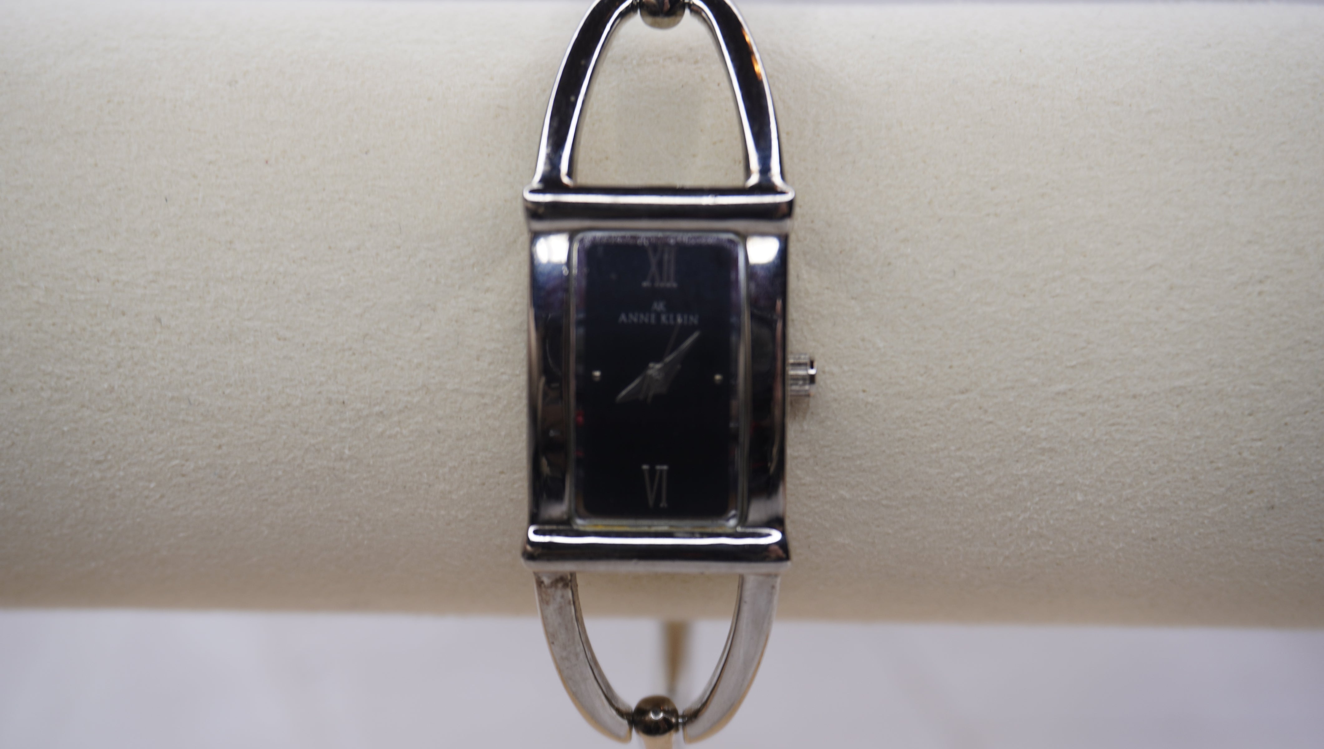 This Anne Klein women’s bangle watch features a sleek silver-tone design paired with a tall rectangular black dial for a refined, modern look. The minimalist layout includes Roman numerals at twelve and six and slim silver hour markers that give the watch a clean, sophisticated appearance.