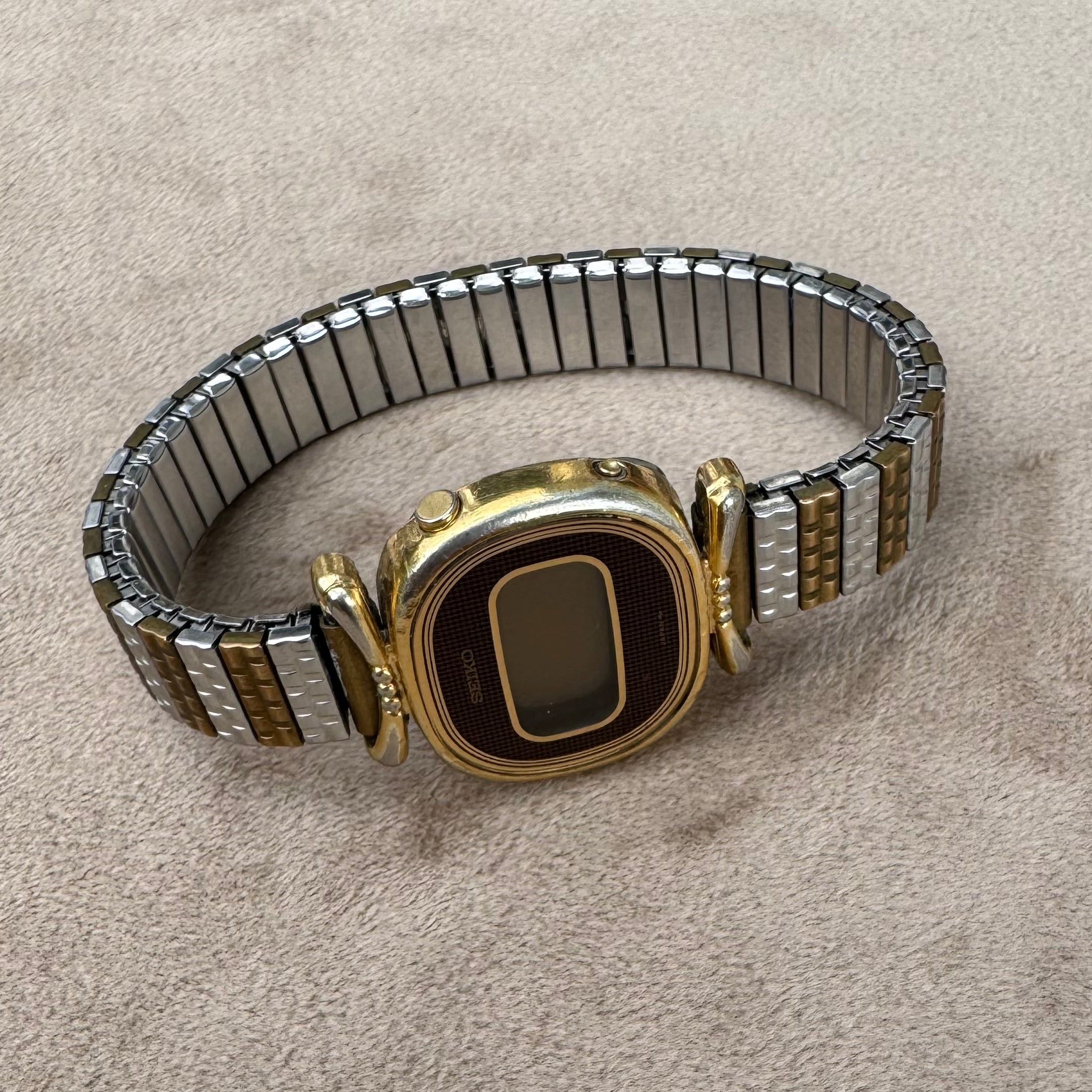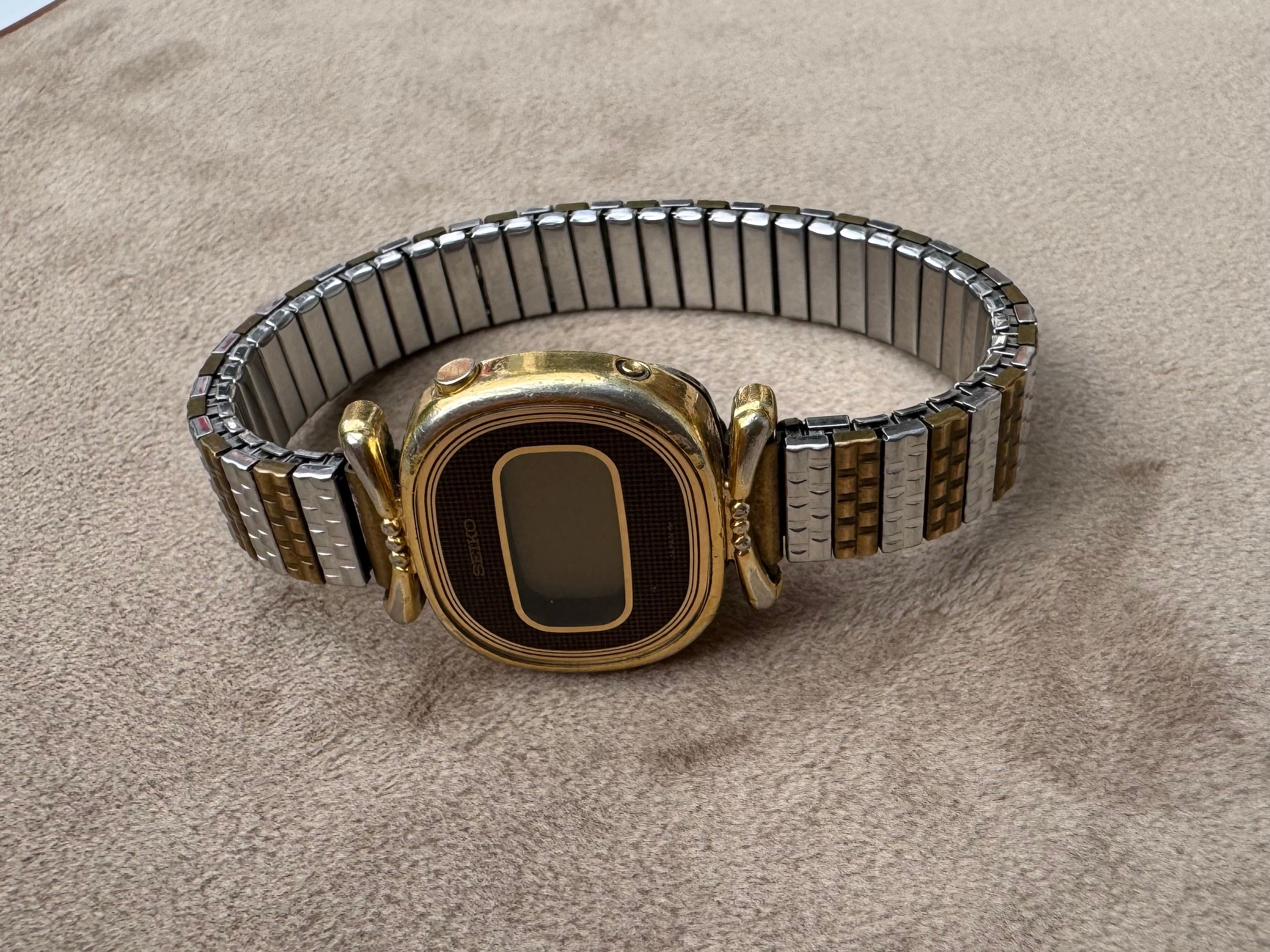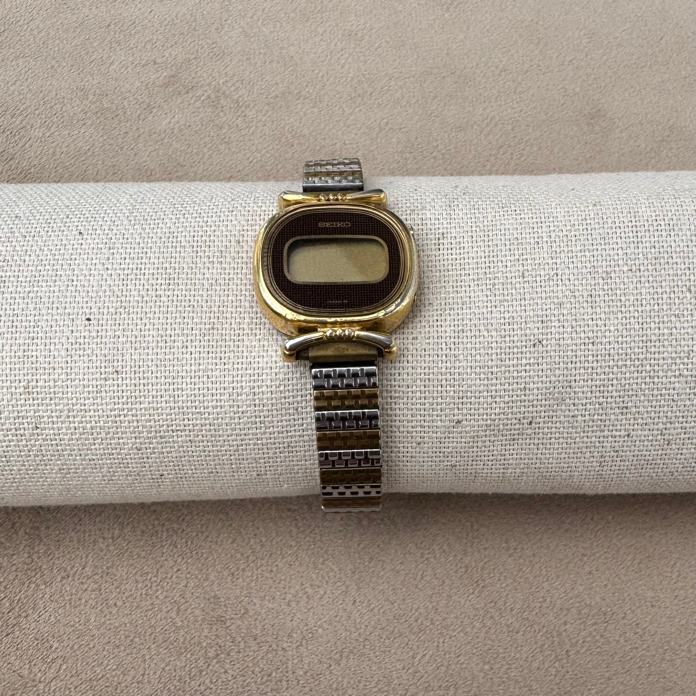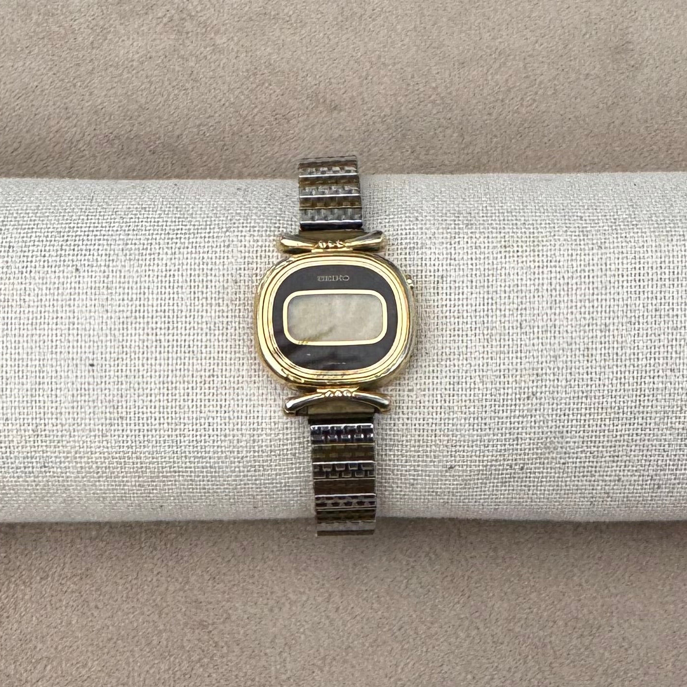 Step back into the bold digital era with this Seiko vintage digital watch — an eye-catching timepiece that blends futuristic 1980s design with refined detail. The oval gold-tone case and textured black dial are complemented by a two-tone expansion band in silver and gold, creating a distinctive look that’s both retro and timeless.