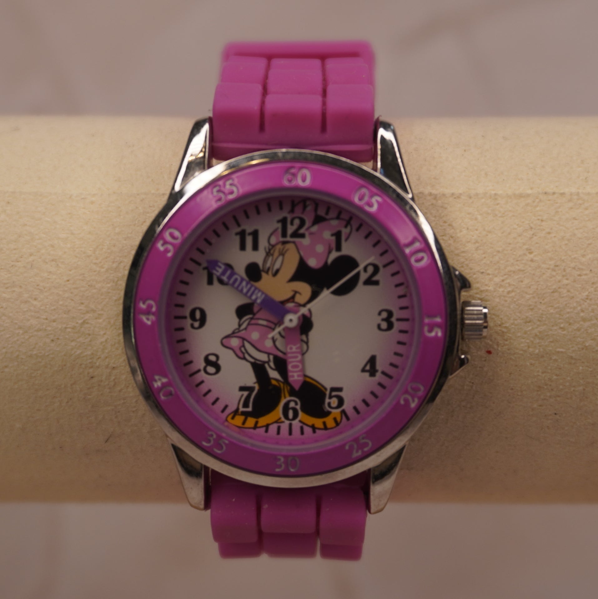 ♡Watch Face: Round, Has Adjustable Manual Timer Dial that is Matte Pink. Minnie Mouse Image with The Indicator Arms Being Purple and Pink and Printed with Her Names in White Font. Glass Pristine.