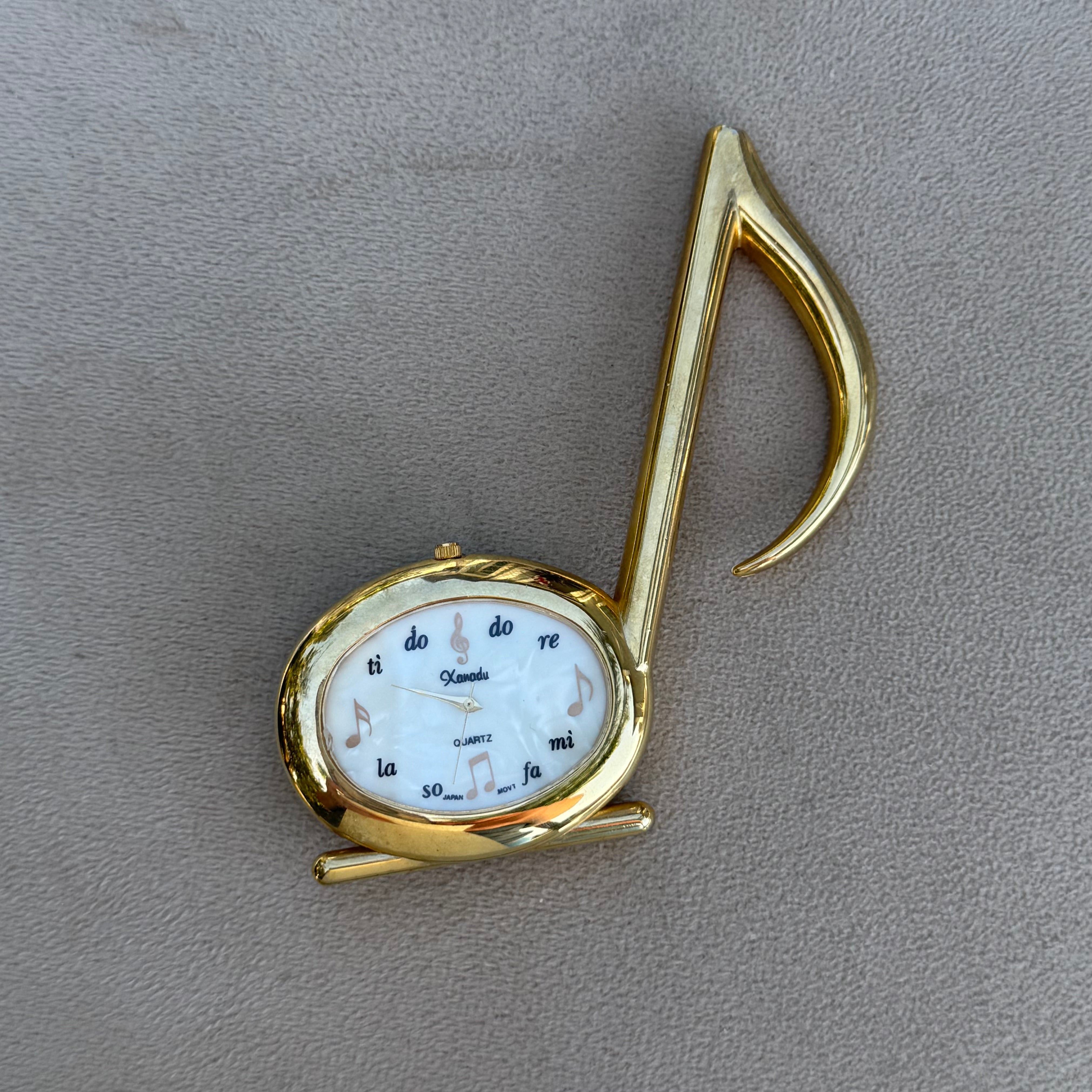 A truly unique find for music lovers and collectors alike — this vintage quartz desk clock is shaped like a gold-tone musical note and features a whimsical dial marked with solfège syllables (Do, Re, Mi, Fa, So, La, Ti, Do) and musical notes instead of traditional numbers.