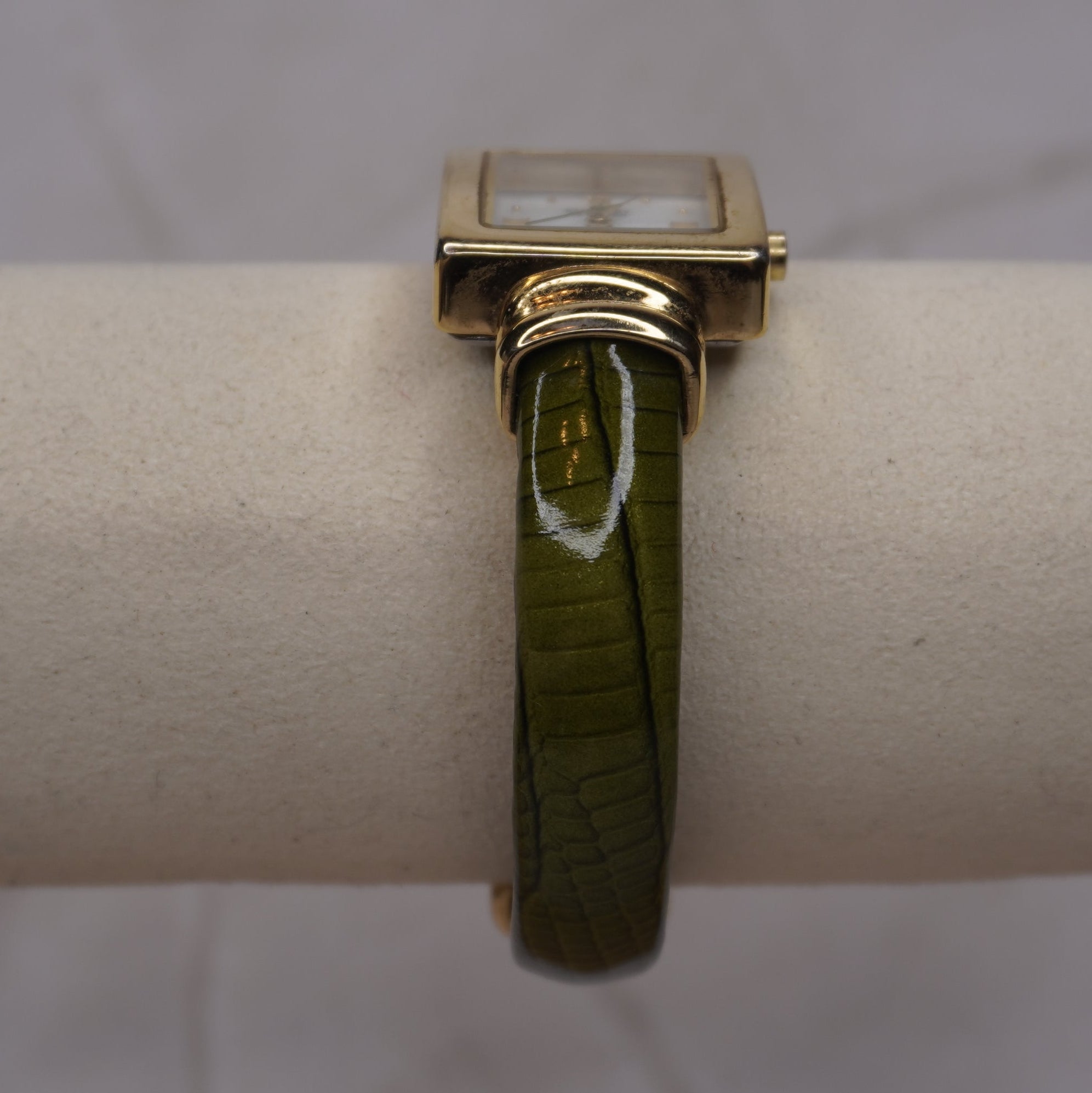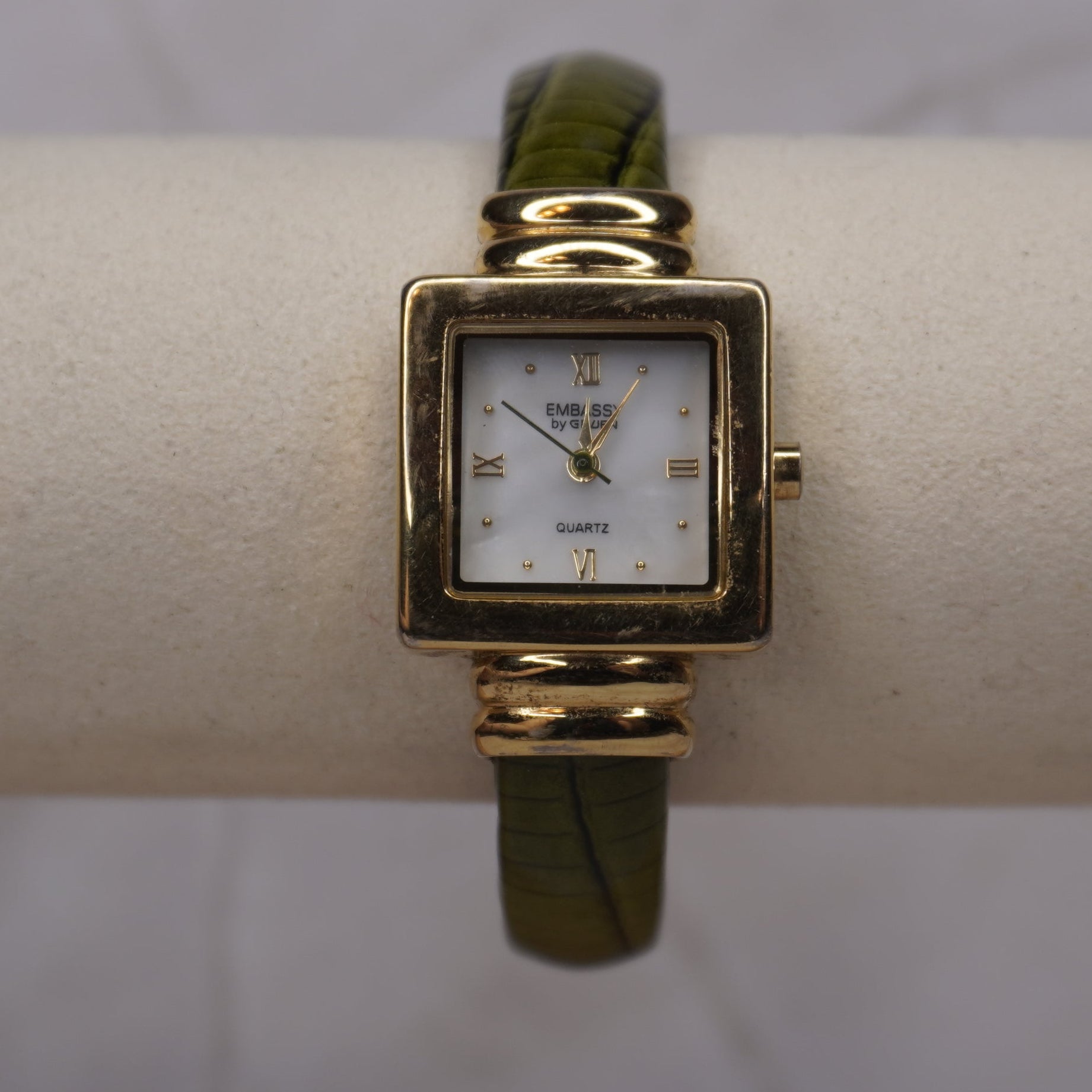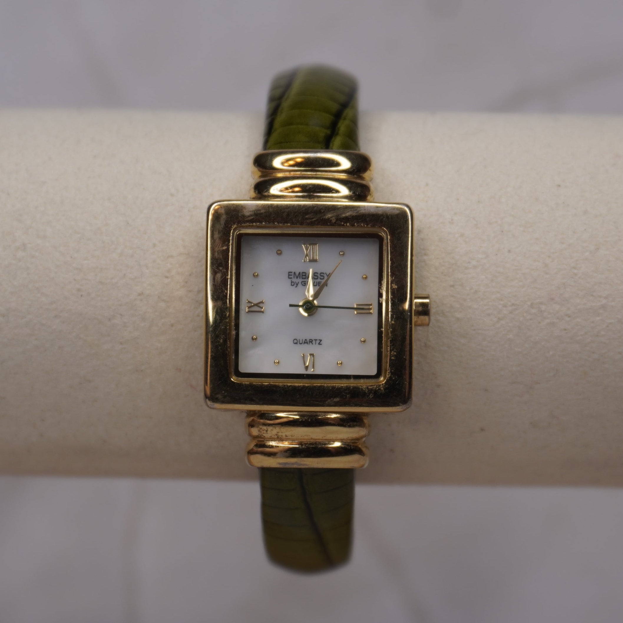 Embassy by Gruen Vintage Gold Watch | Square Mother of Pearl Dial | Olive Green Textured Band | Grace Dreams Vintage