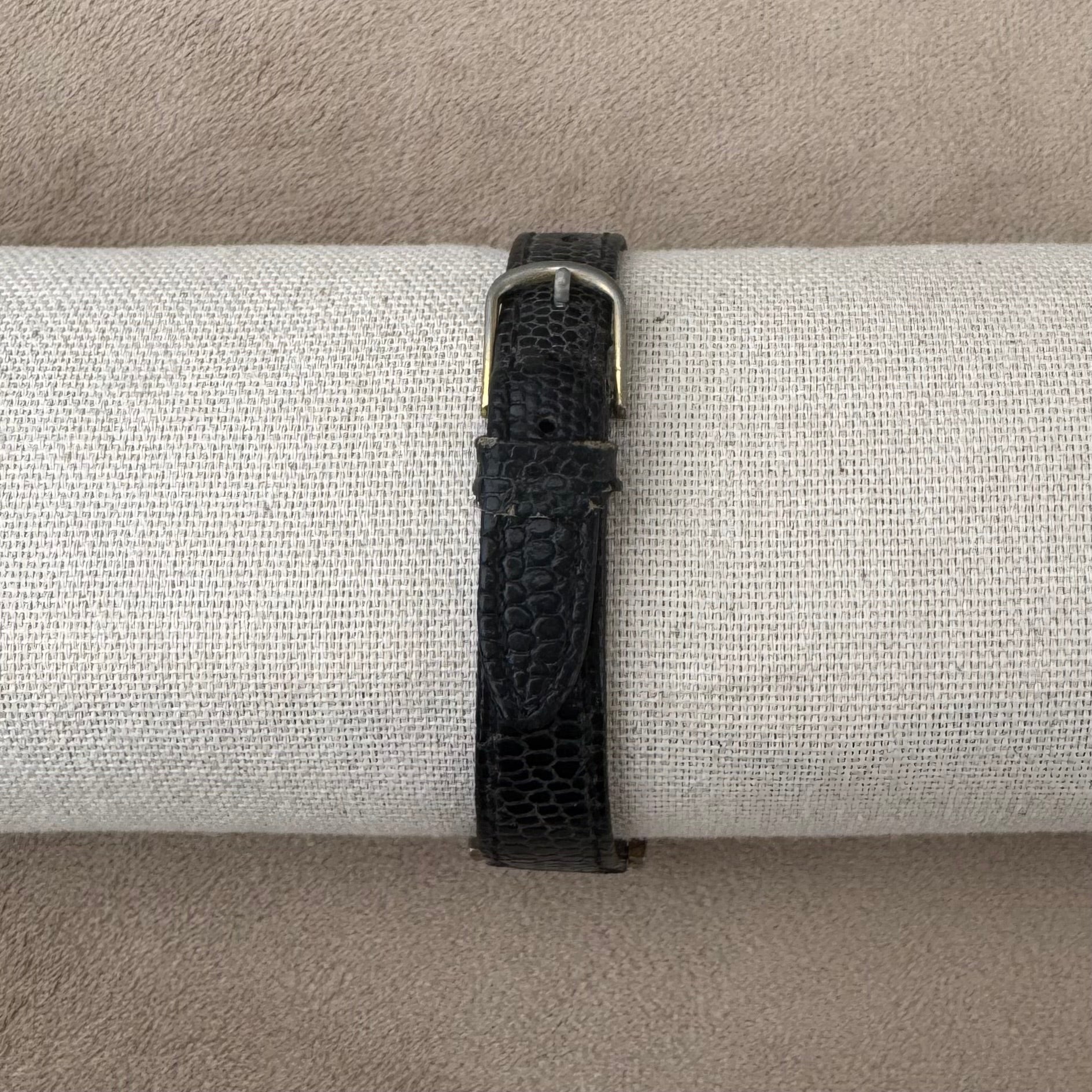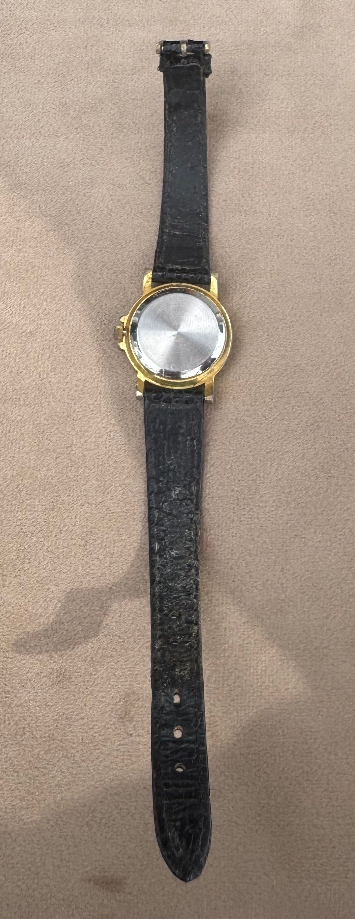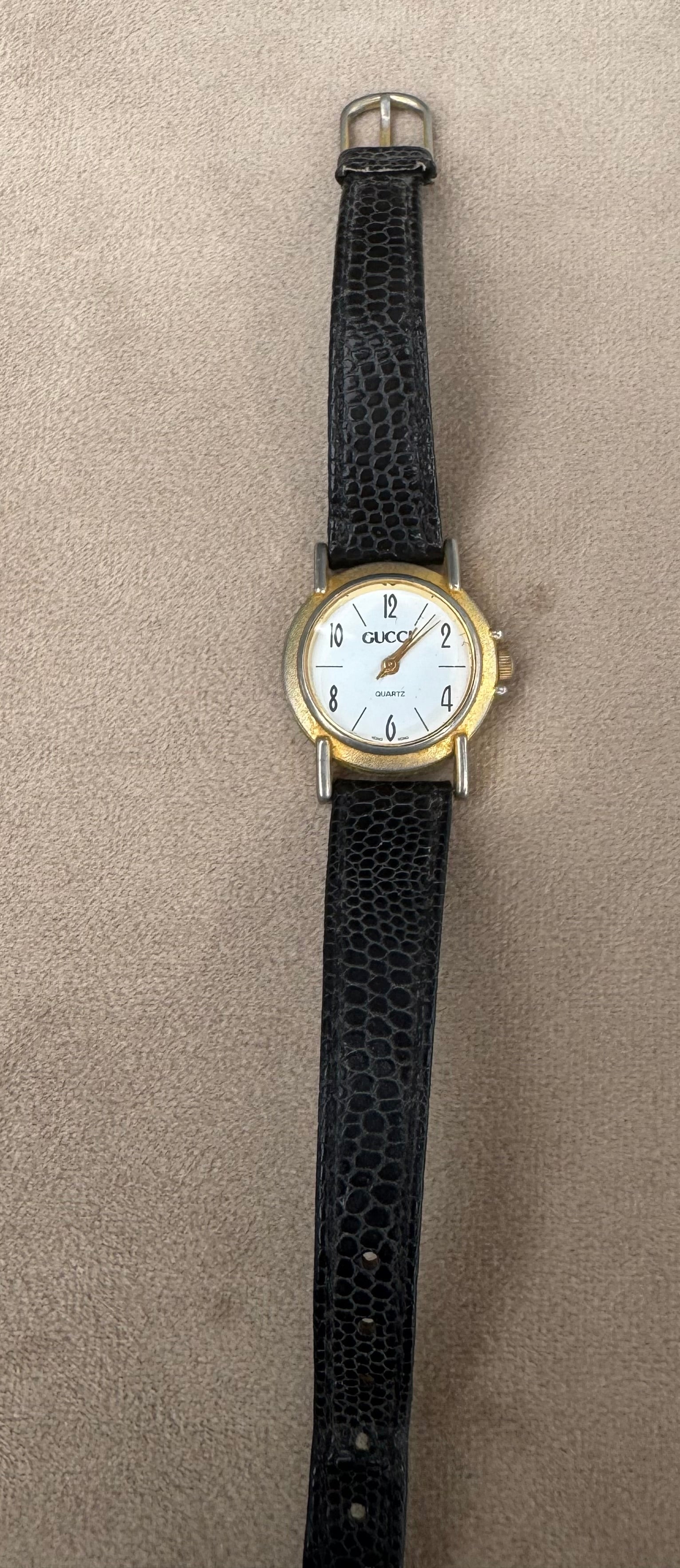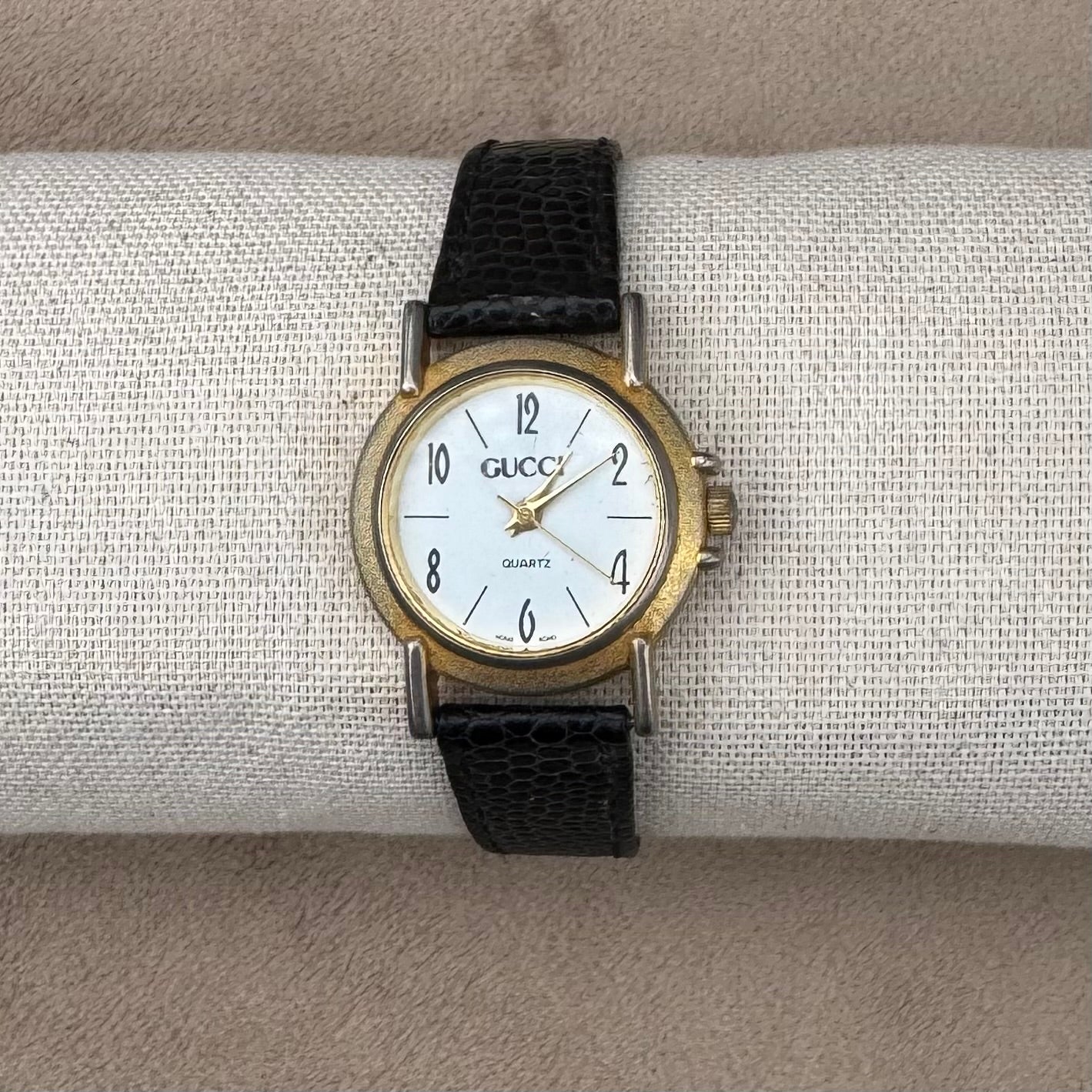 A timeless Gucci women’s quartz watch featuring a sleek gold-tone bezel, elegant white dial, and genuine black leather strap. Its minimalist face and clean detailing showcase Gucci’s signature sophistication — perfect for both everyday wear and vintage collectors.
