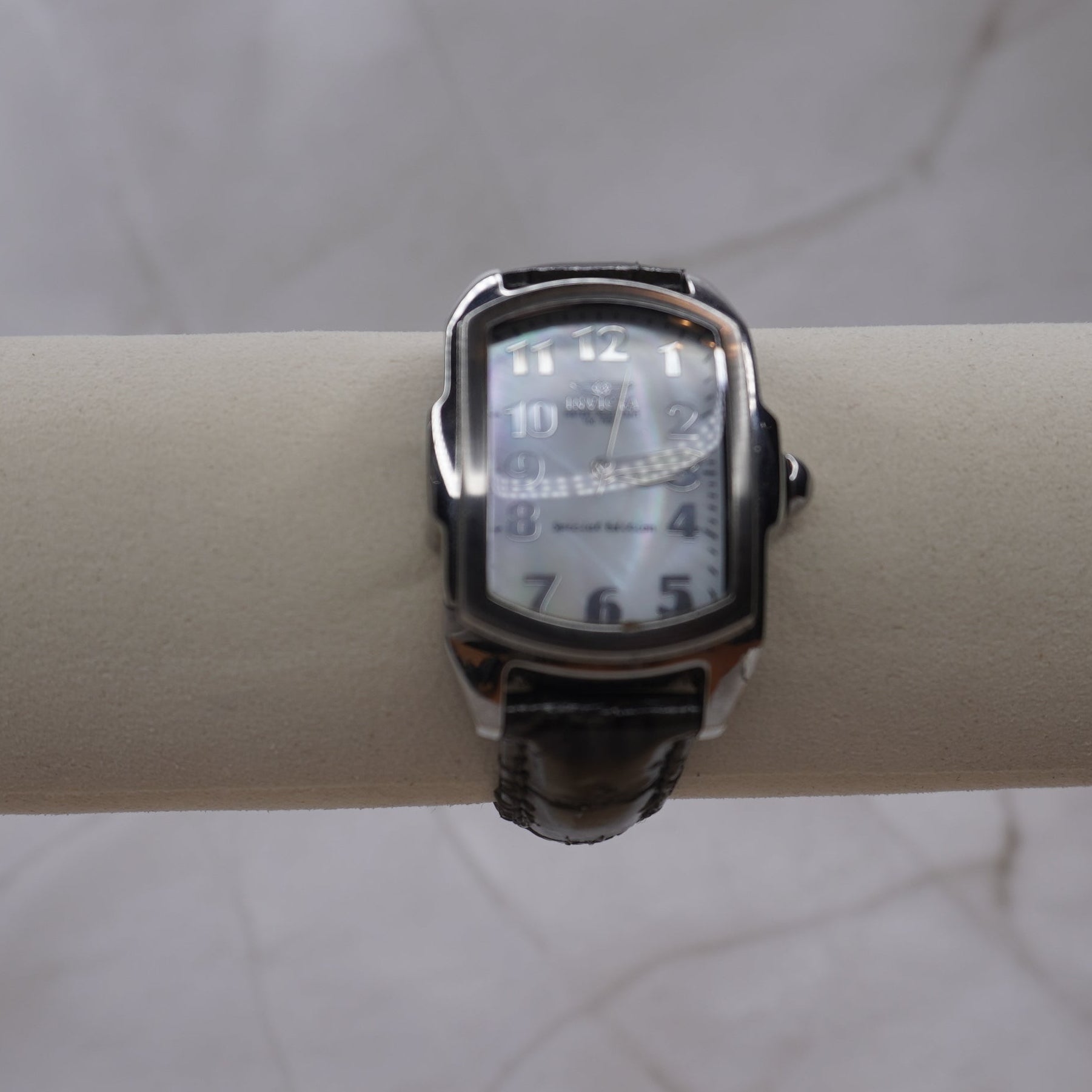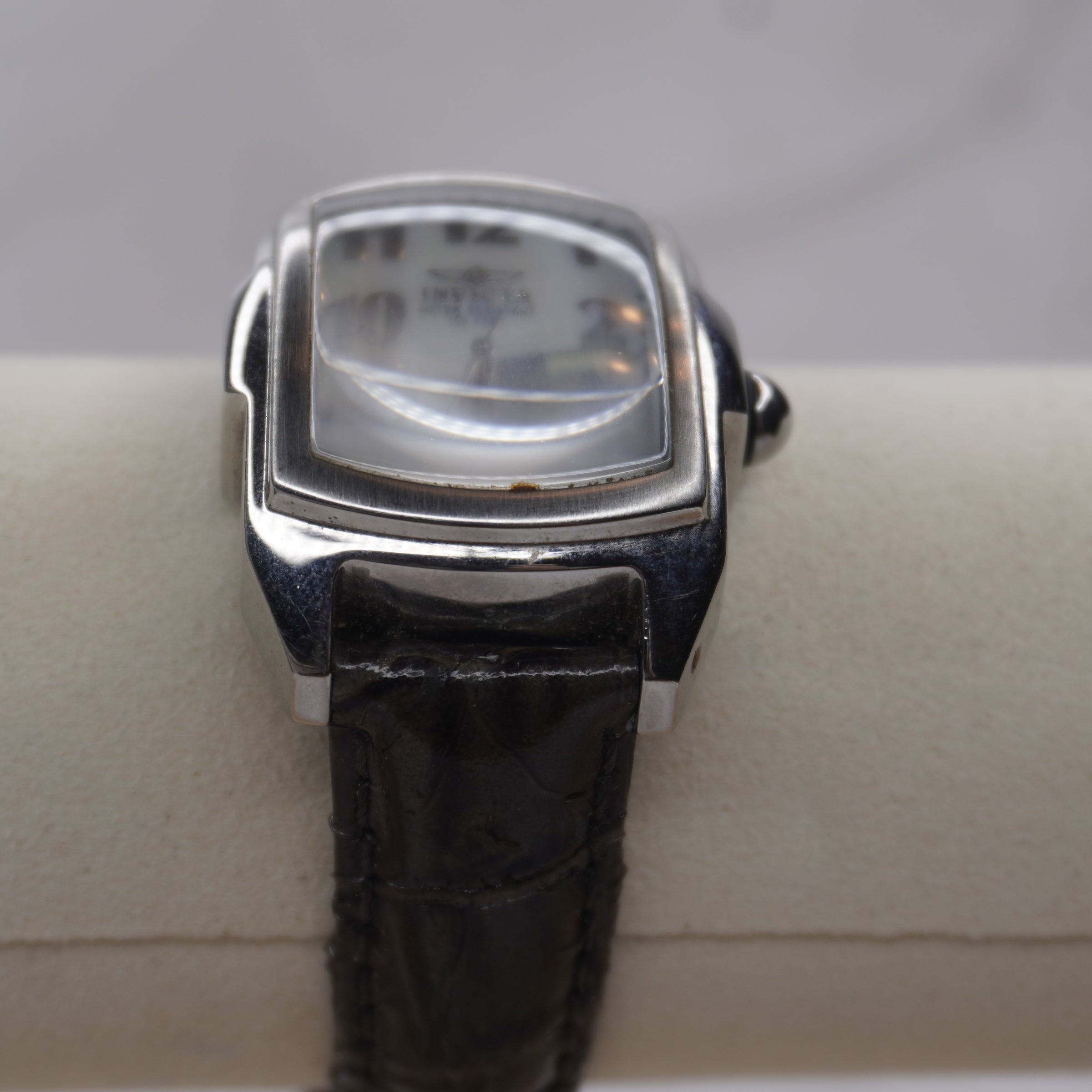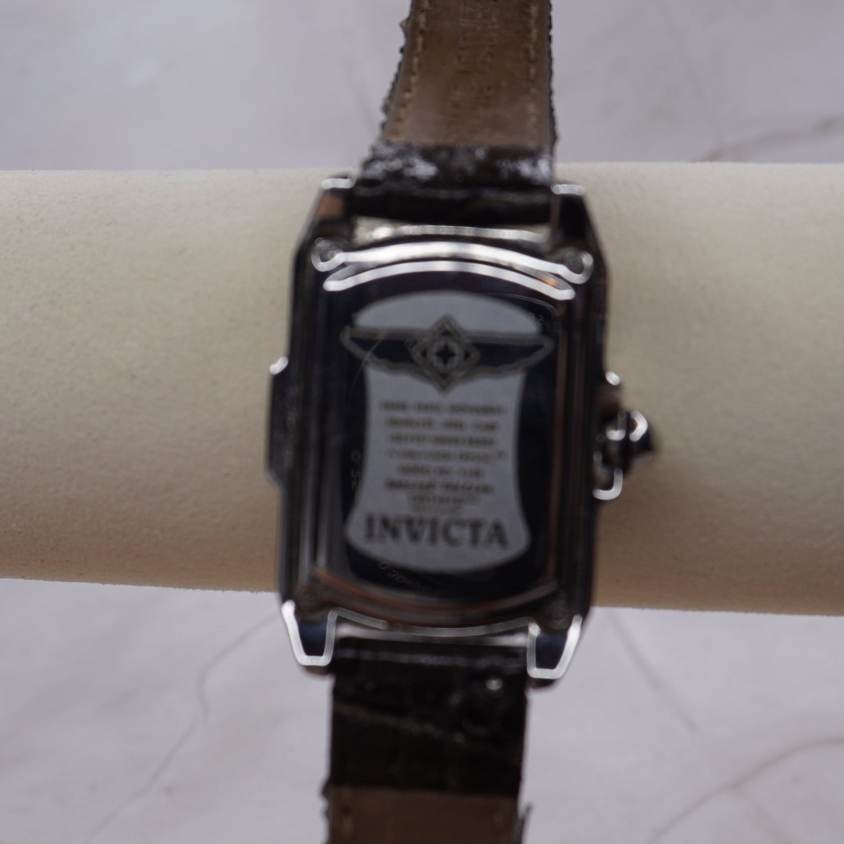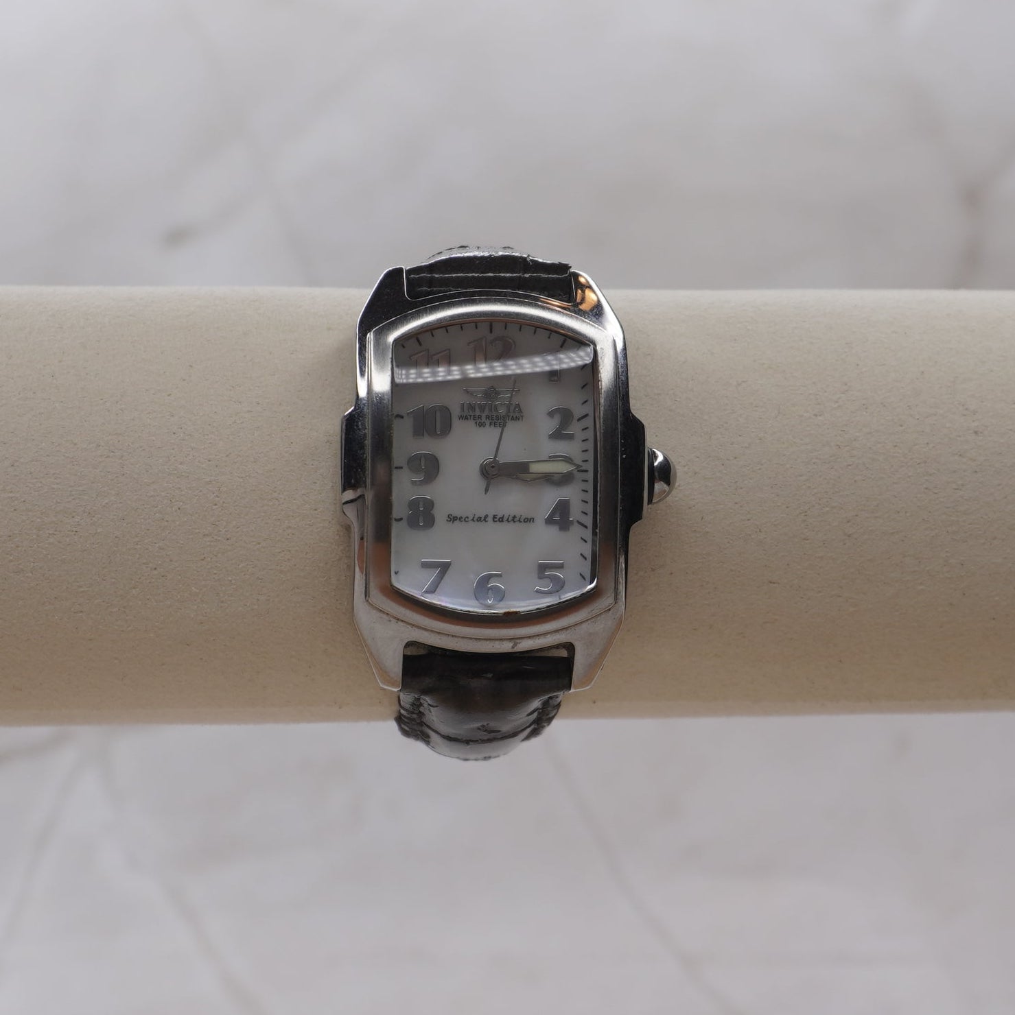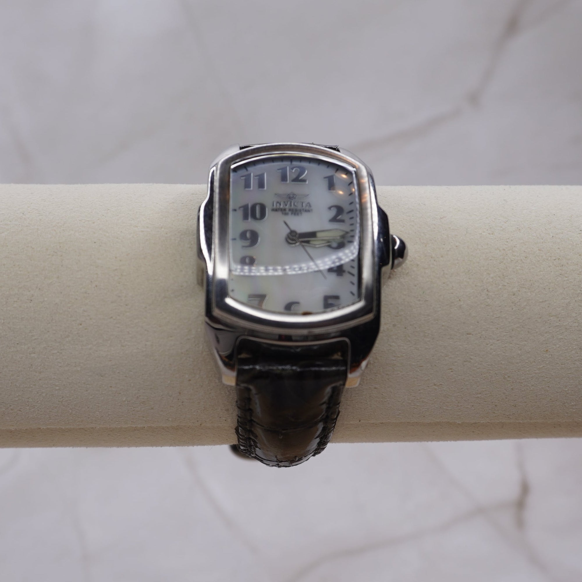 A stylish and rare Invicta timepiece featuring a curved tonneau-shaped silver case, pearlized dial, and bold raised numerals. This watch offers a unique blend of vintage-inspired design and durable construction, making it perfect for everyday wear or collection.