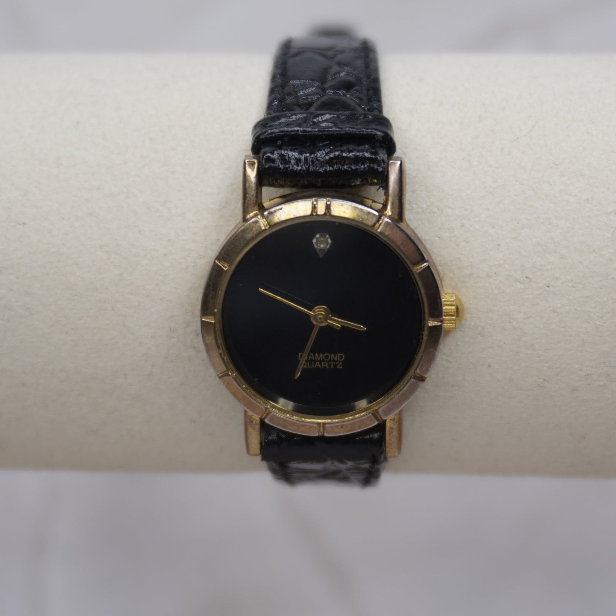 ♡Watch Face: Black Matte Finish in Circle Face, Gold Gloss Arms, Diamond #12 Pear Shaped. Gold Exterior Perimeter with Indent Pattern