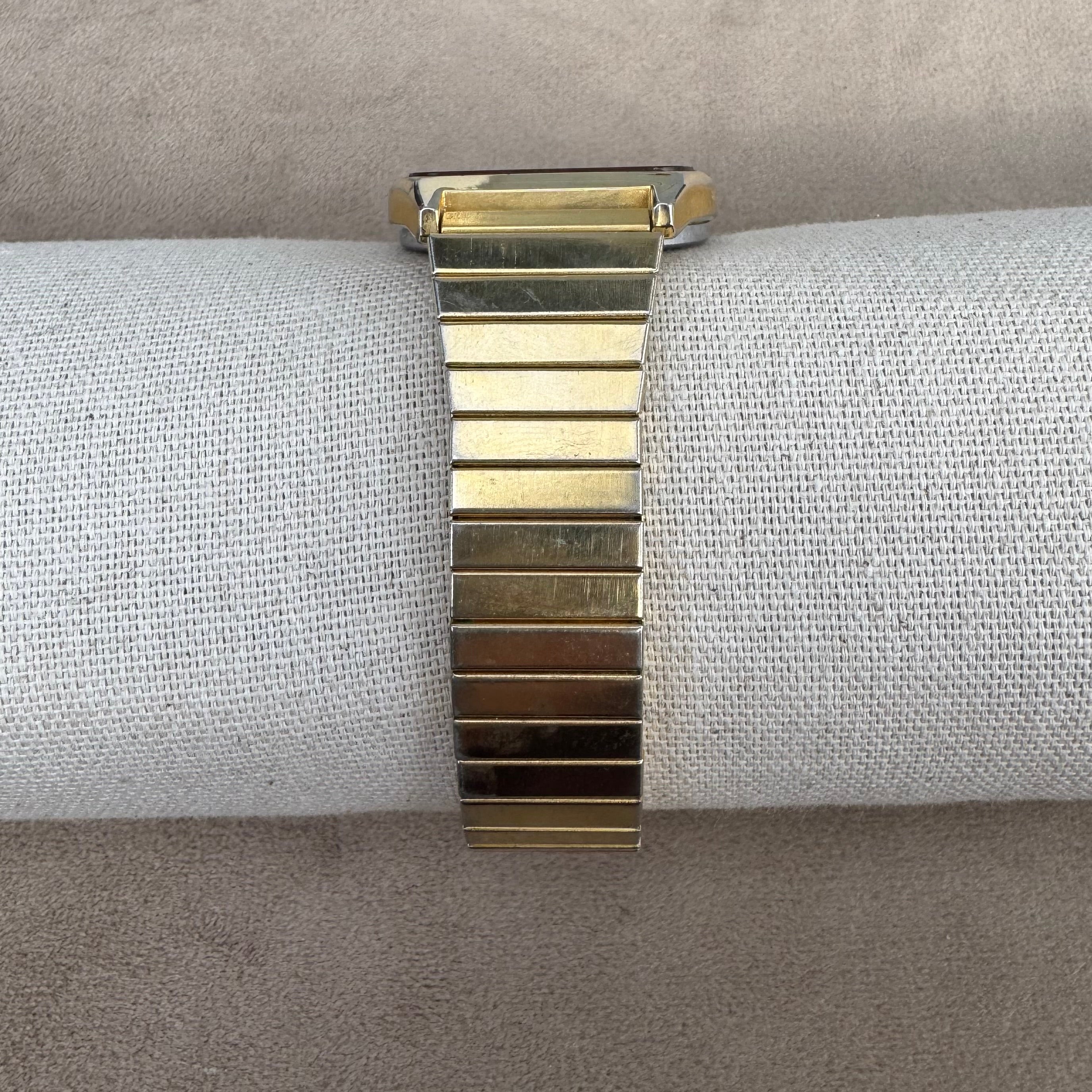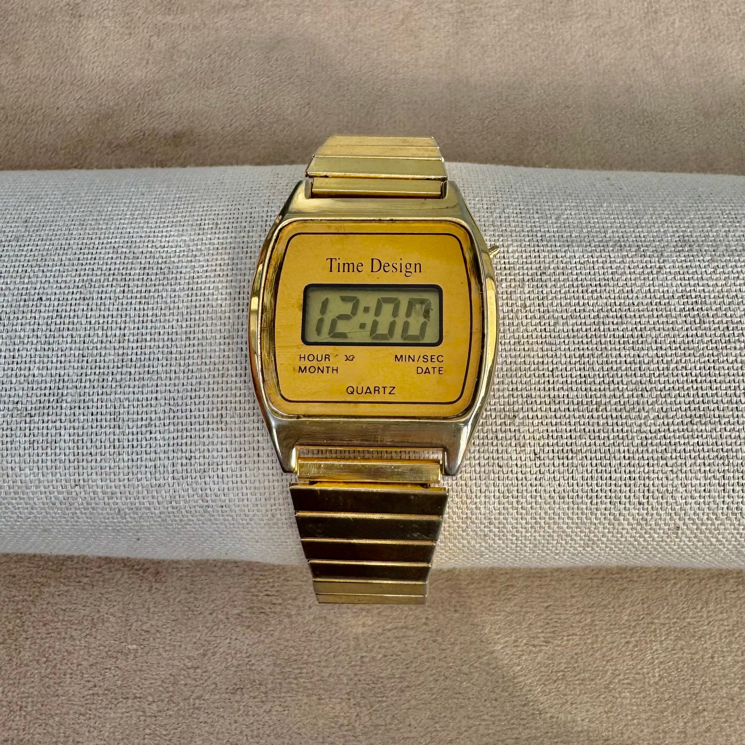 Step back into the golden age of retro tech with this vintage Time Design digital watch — a nostalgic throwback to the bold digital era of the late 1970s and 1980s. Featuring a square gold-tone case and matching expansion band, this quartz timepiece combines minimalist design with practical digital functionality.