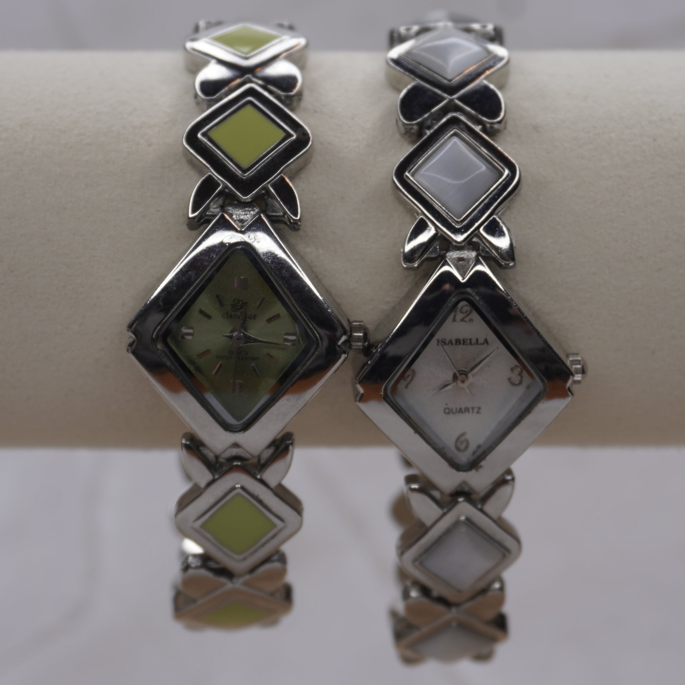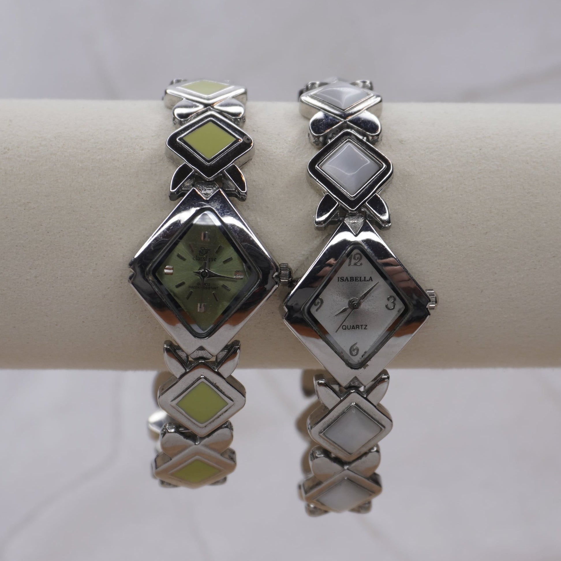 Vintage Diamond-Shaped Bracelet Watches Set | Silver Tone Enamel Link Bands | Isabella & Classicque Quartz Watches | Unique Women’s Jewelry Gift
