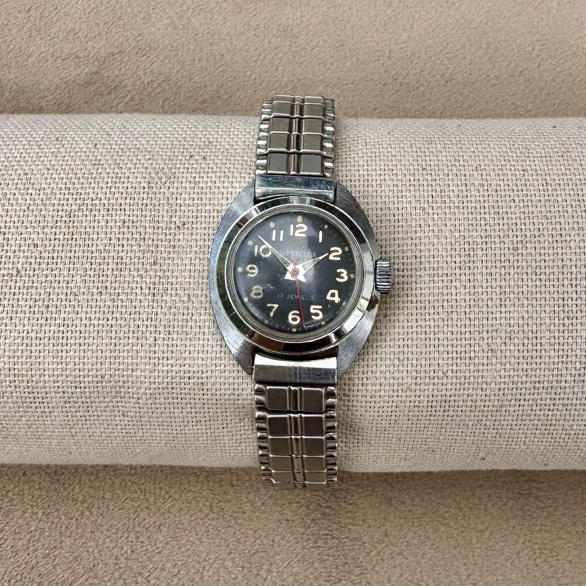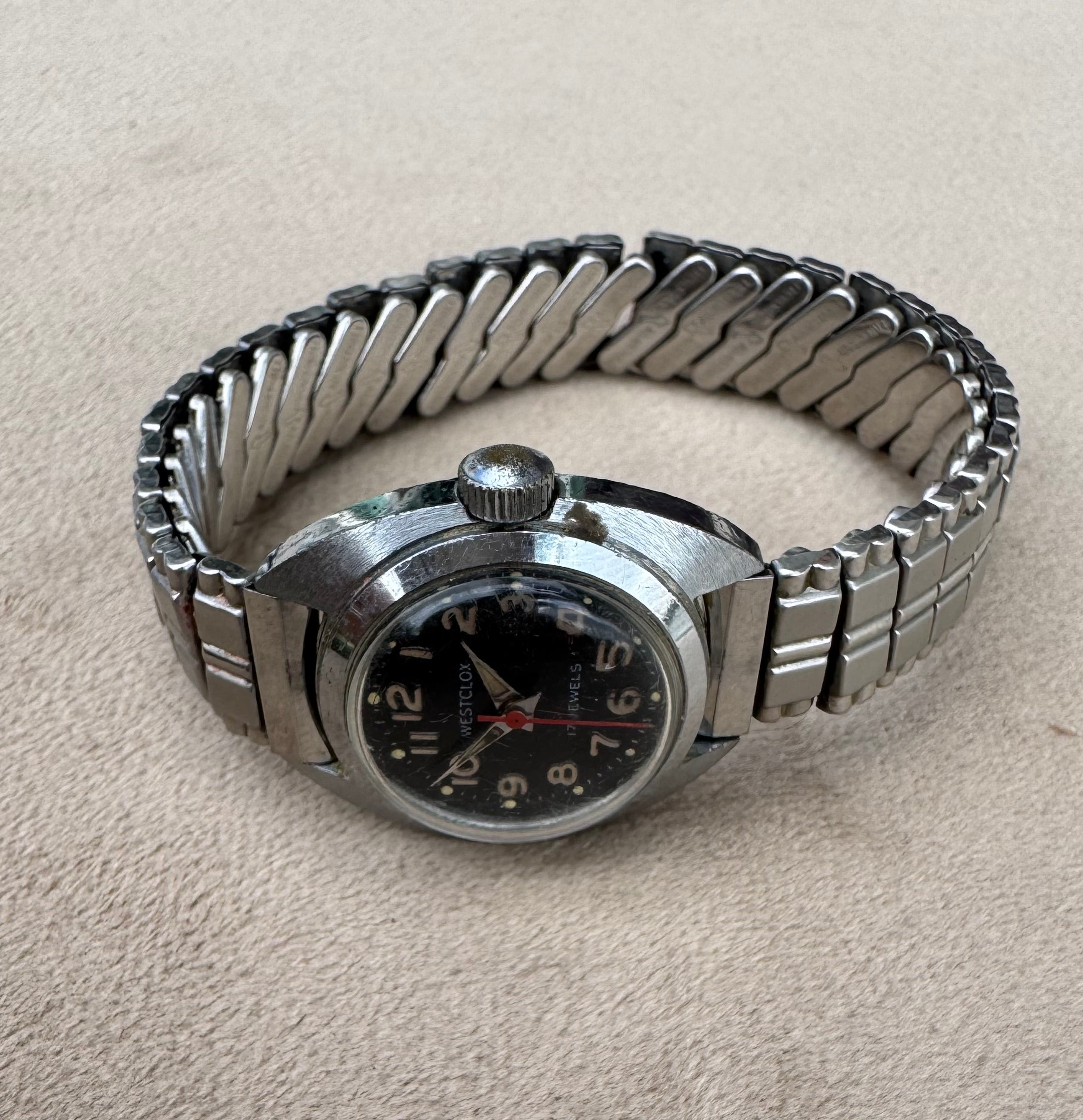 Add a piece of classic American timekeeping history to your collection with this vintage Westclox 17 Jewels wristwatch. Known for its reliability and charm, this mid-century mechanical timepiece features a bold black dial with luminous numerals and a timeless stainless steel expansion band — the perfect blend of vintage utility and everyday style.