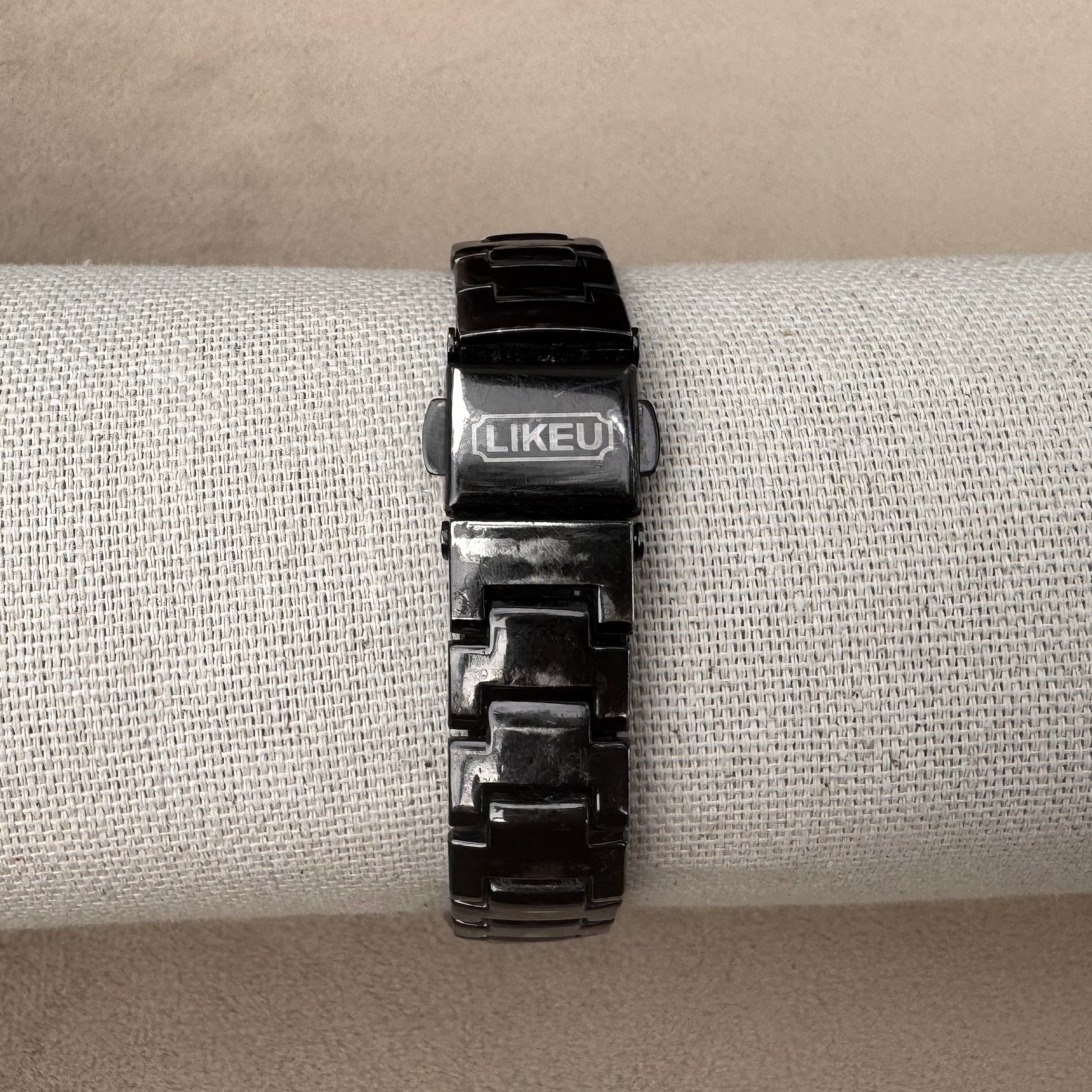 A modern statement with vintage flair — this black Likeli timepiece blends bold design with refined simplicity. The high-shine black link bracelet gives off a polished, ceramic-like finish, while the deep black dial is accented with golden Roman numerals and crystal hour markers.